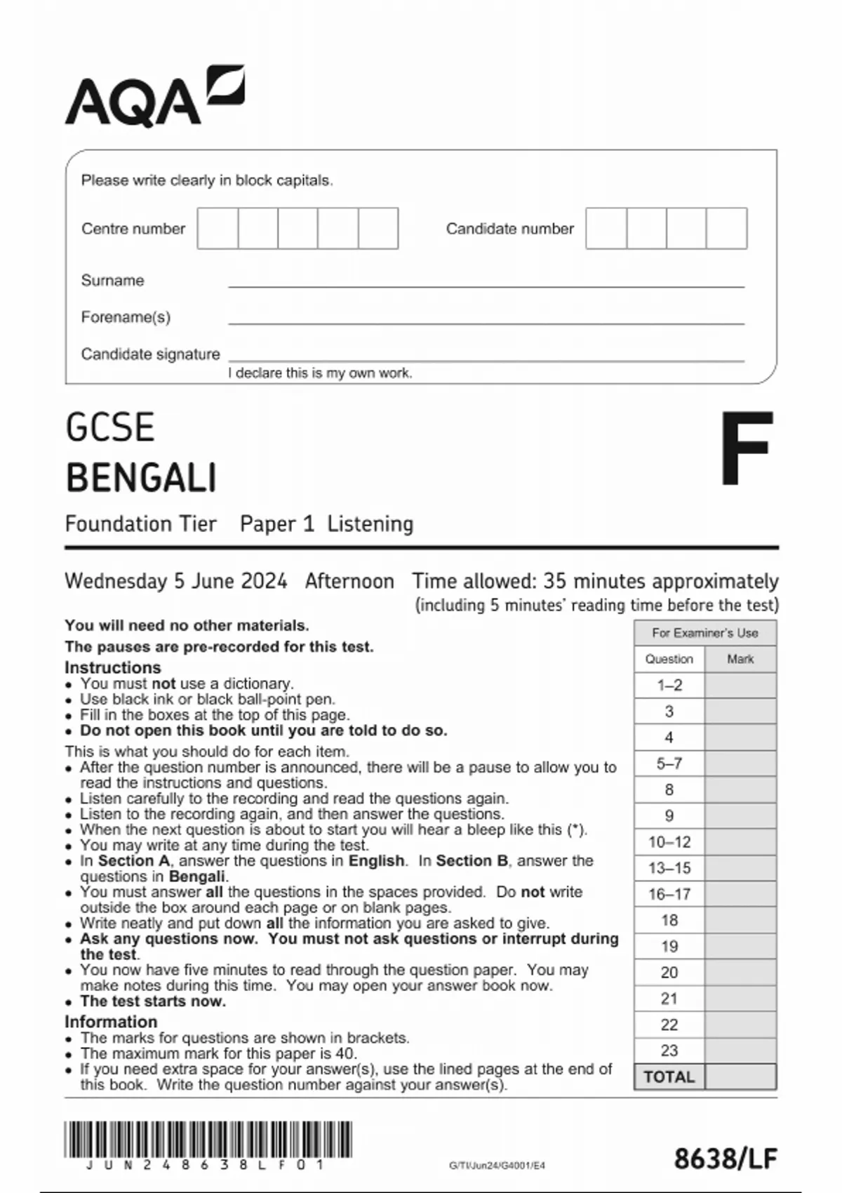 AQA GCSE BENGALI QUESTION PAPER 1 2024 [8638:LF Foundation Tier Listening]