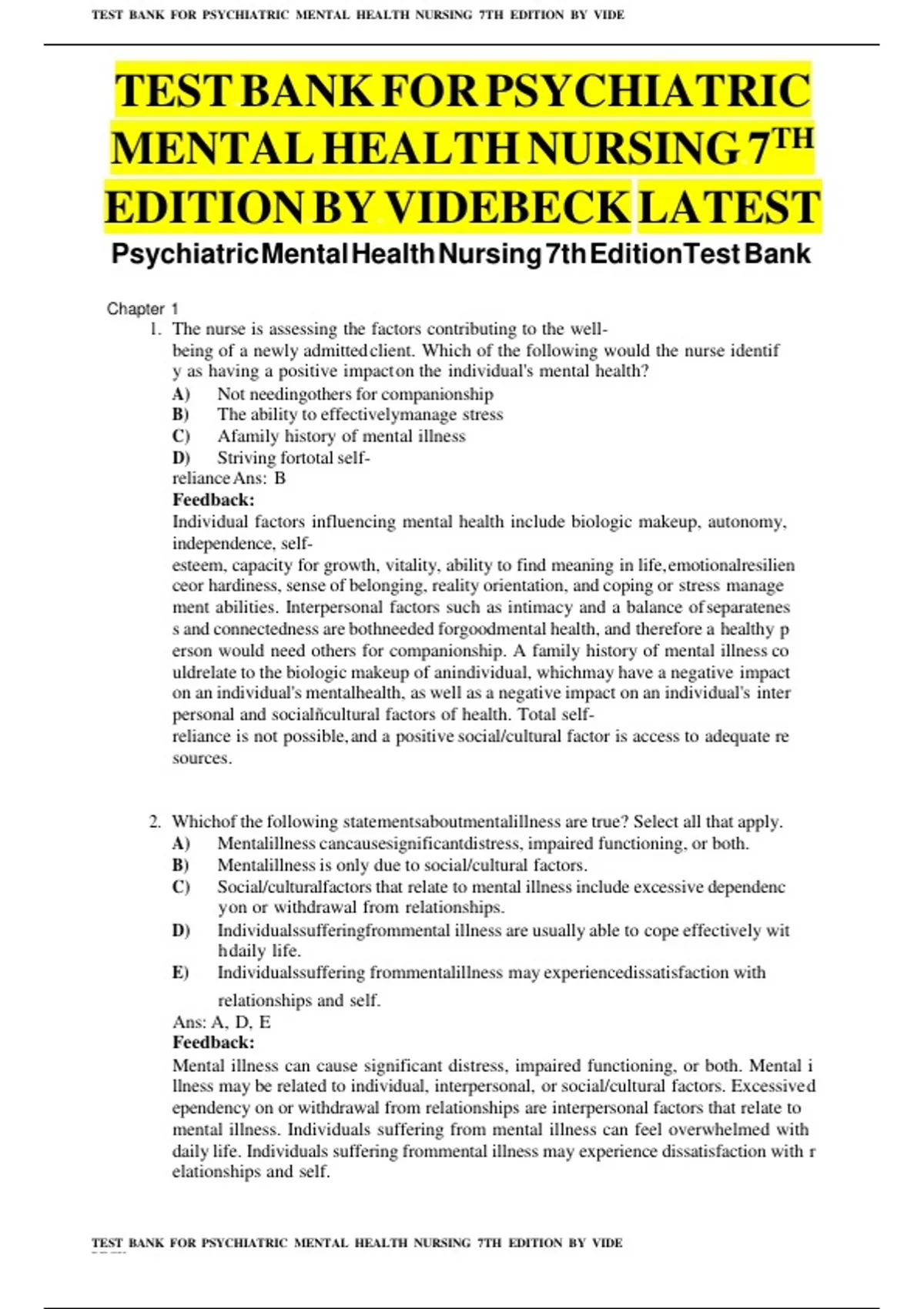 , TESTmBANKmFORmPSYCHIATRICmMENTALmHEALTHmNURSINGm7THmEDITIONmBYmVIDE