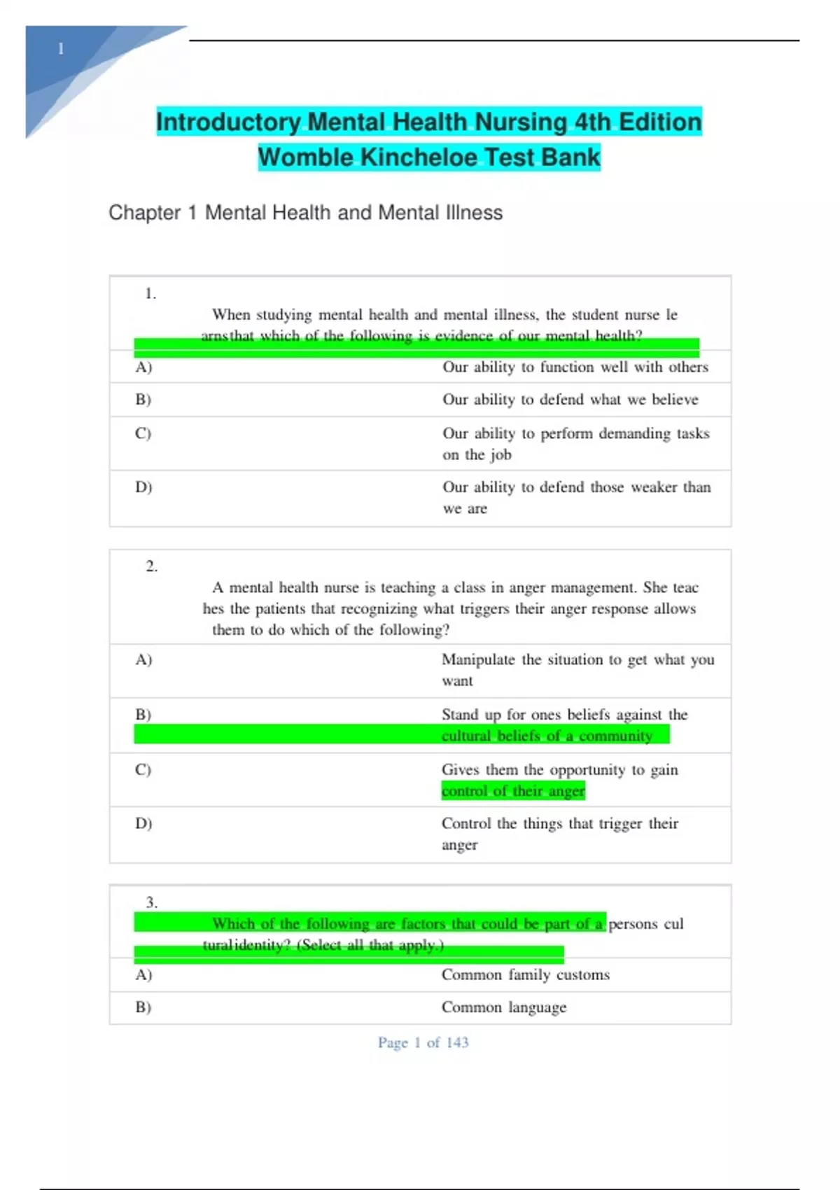 Introductory mental health nursing 4th edition womble kincheloe test bank