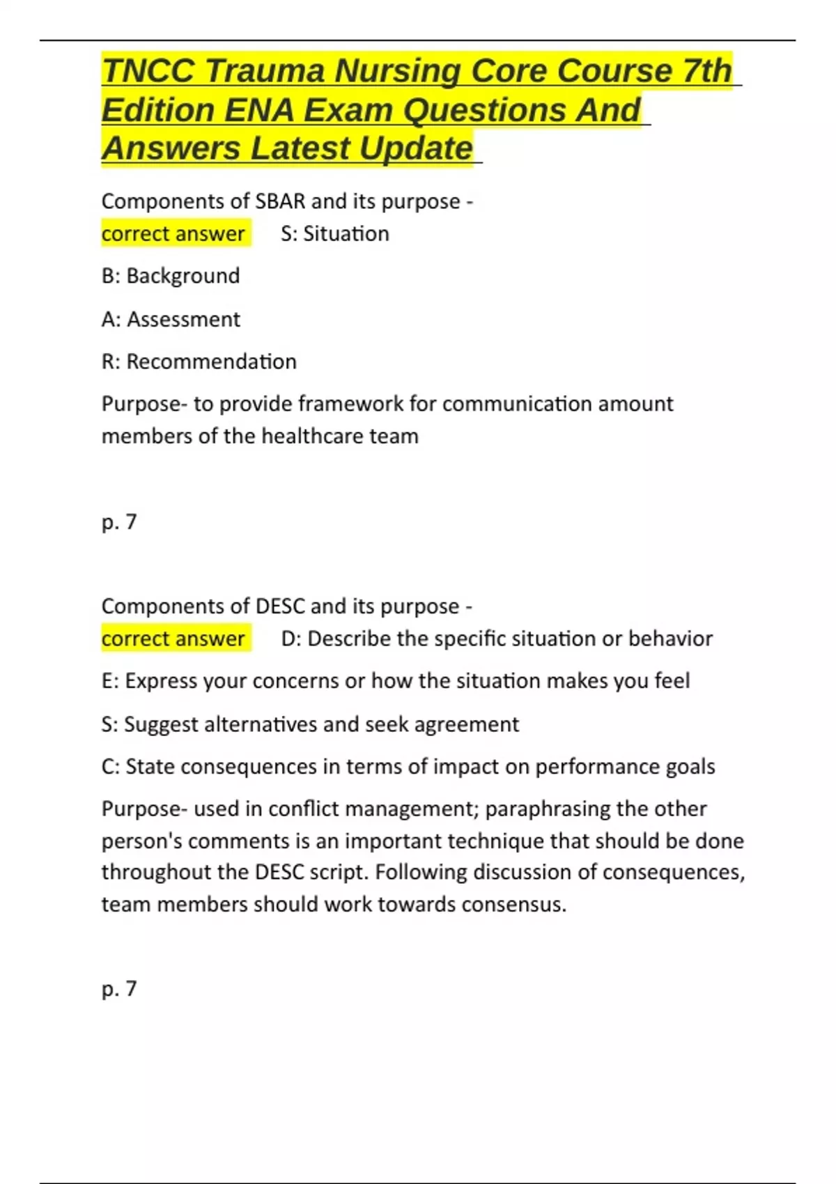 TNCC Trauma Nursing Core Course 7th Edition ENA Exam Questions And Answers Latest Update
