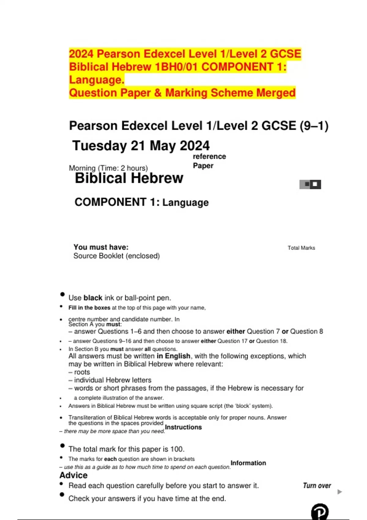 2024 Pearson Edexcel Level 1/Level 2 GCSE Biblical Hebrew 1BH0/01 COMPONENT 1: Language. Question Paper & Marking Scheme Merged Pearson Edexcel Level 1/Level 2 GCSE (9–1) Tuesday 21 May 2024 reference 1BH0/01