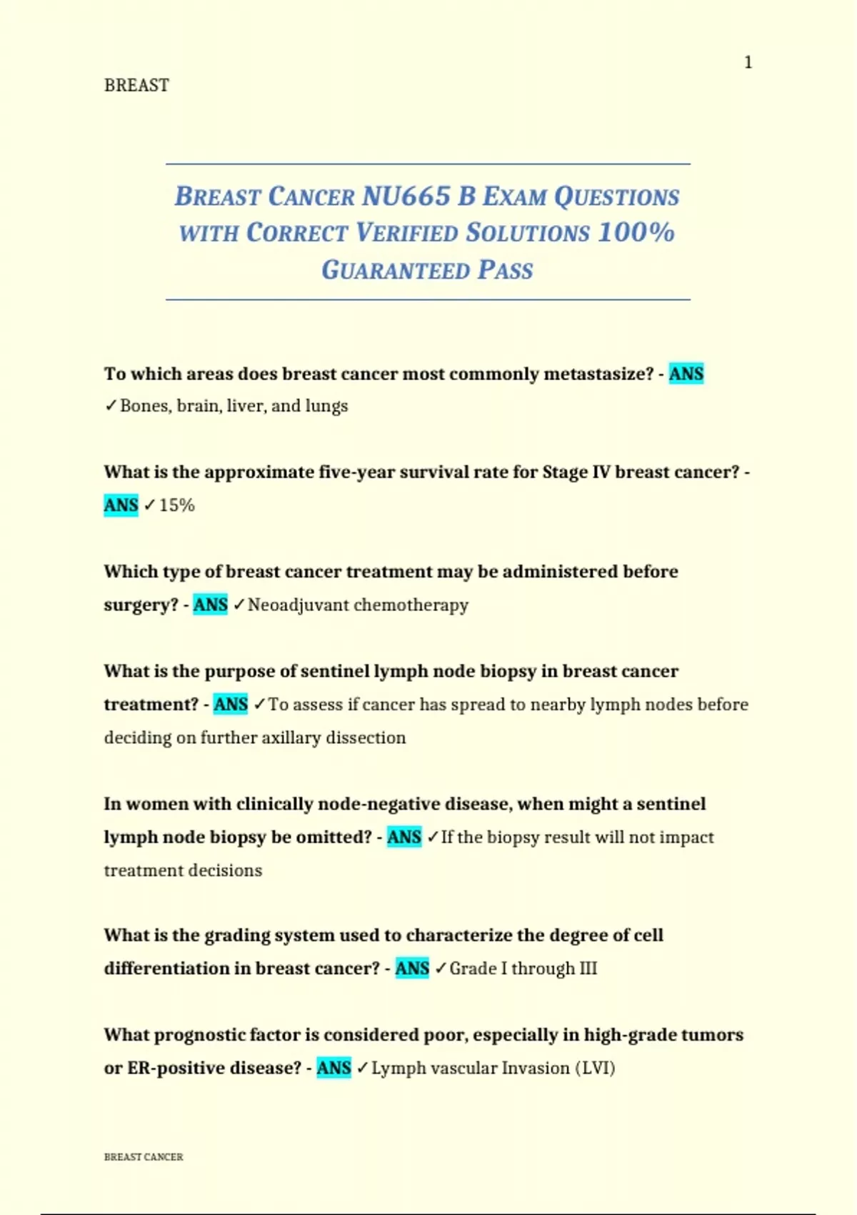 BREAST CANCER NU665 B EXAM QUESTIONS