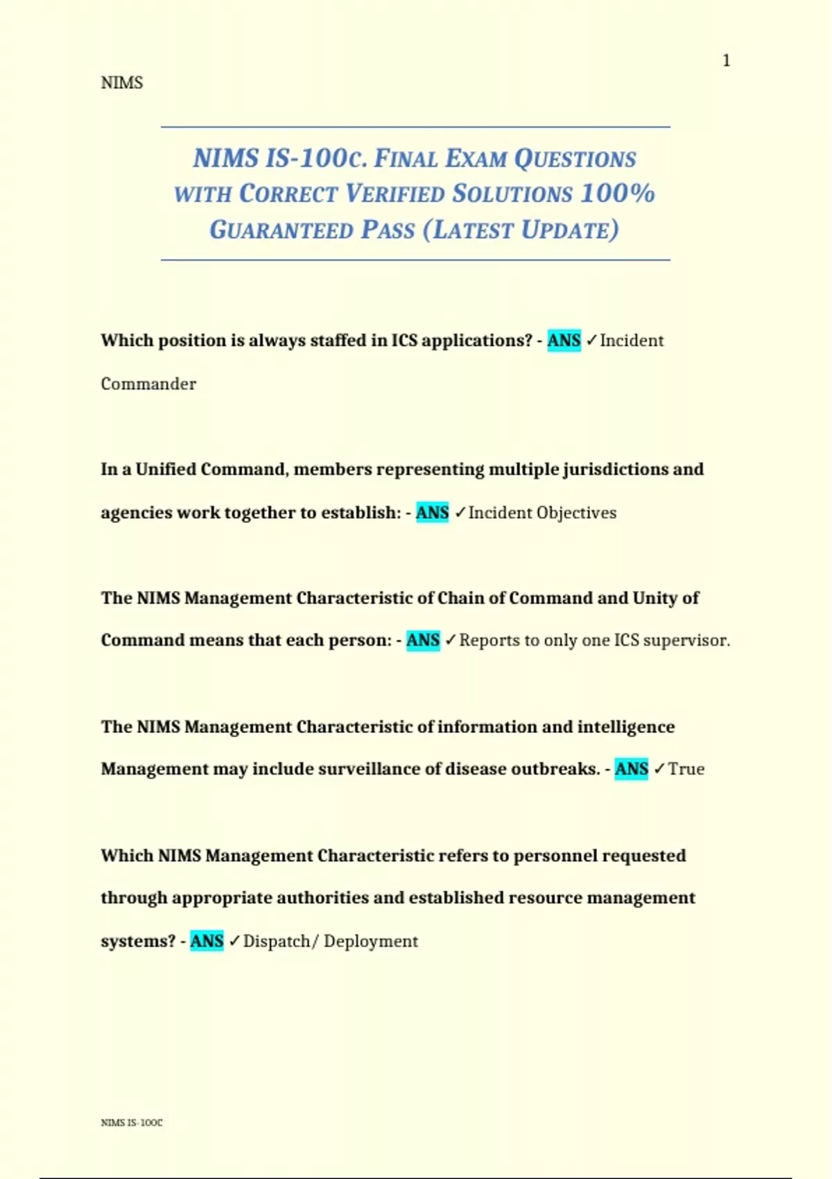 NIMS IS-100C. FINAL EXAM QUESTIONS WITH CORRECT VERIFIED SOLUTIONS 100% GUARANTEED PASS (LATEST UPDATE)