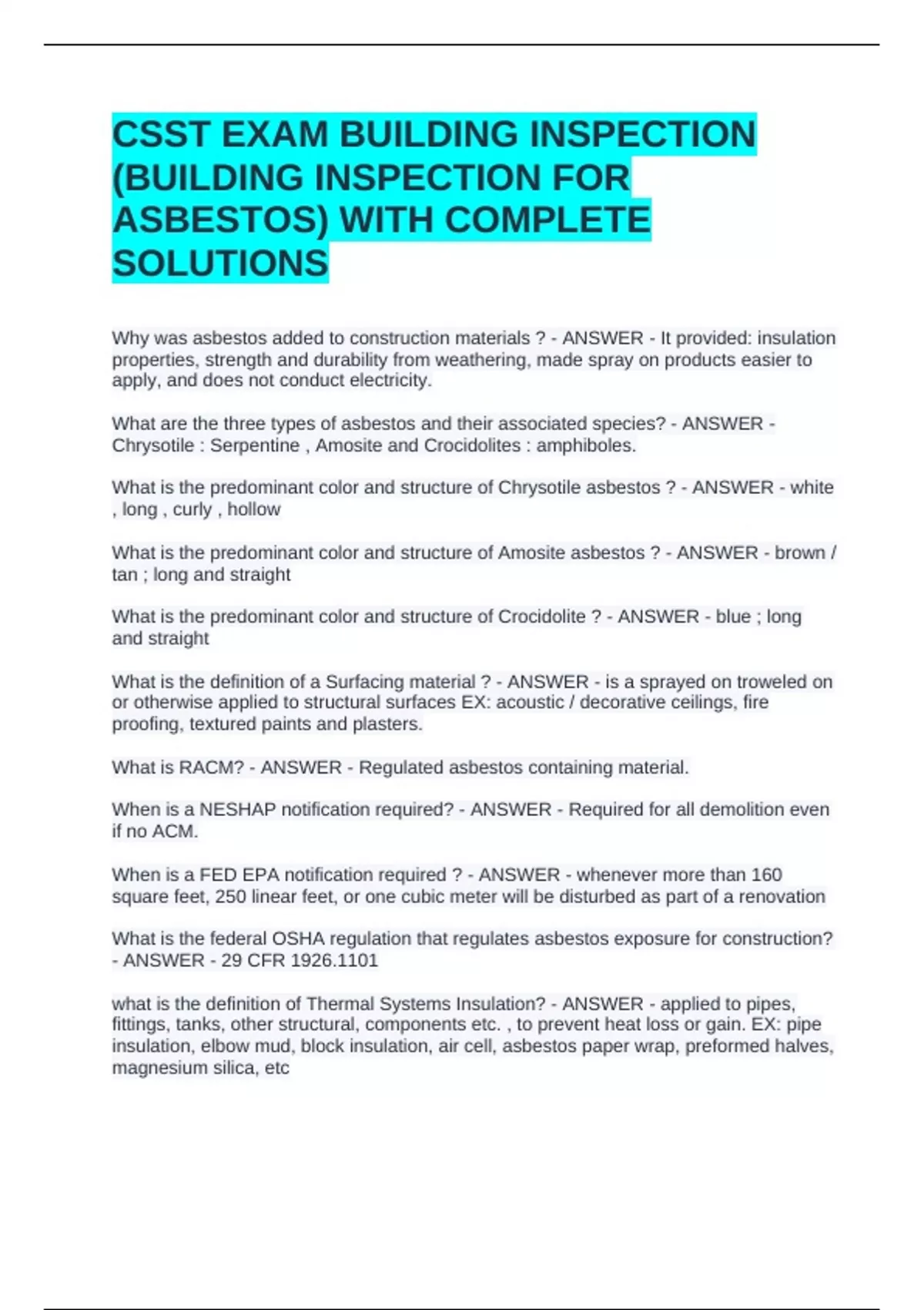 CSST EXAM BUILDING INSPECTION (BUILDING INSPECTION FOR ASBESTOS) WITH COMPLETE SOLUTIONSCSST EXAM BUILDING INSPECTION (BUILDING INSPECTION FOR ASBESTOS) WITH COMPLETE SOLUTIONSCSST EXAM BUILDING INSPECTION (BUILDING INSPECTION FOR ASBESTOS) WITH COMPLETE SOLUTIONS Why was asbestos added to construction materials ? - ANSWER - It provided: insulation properties, strength and durability from weathering, made spray on products easier to apply, and does not conduct electricity. What are the three types of asbestos and their associated species? - ANSWER - Chrysotile : Serpentine , Amosite and Crocidolites : amphiboles. What is the predominant color and structure of Chrysotile asbestos ? - ANSWER - white , long , curly , hollow What is the predominant color and structure of Amosite asbestos ? - ANSWER - brown /