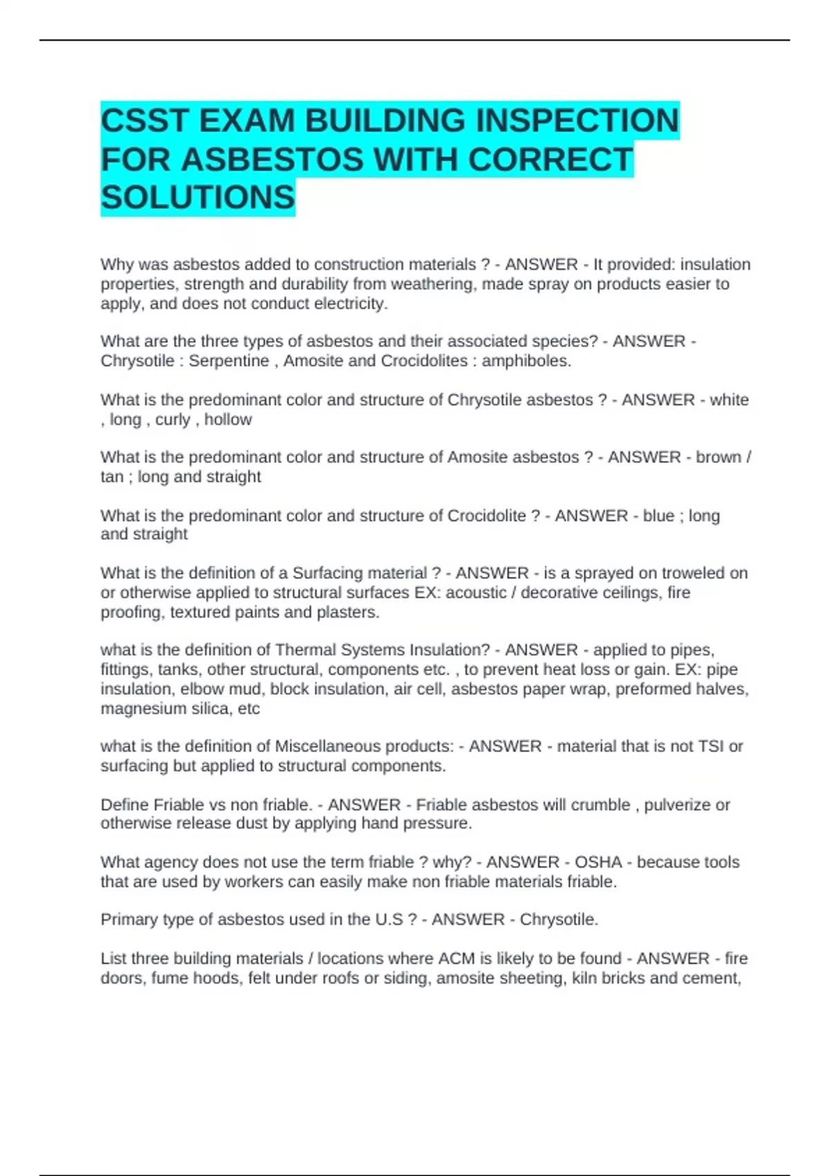 CSST EXAM BUILDING INSPECTION FOR ASBESTOS WITH CORRECT SOLUTIONSCSST EXAM BUILDING INSPECTION FOR ASBESTOS WITH CORRECT SOLUTIONSCSST EXAM BUILDING INSPECTION FOR ASBESTOS WITH CORRECT SOLUTIONSCSST EXAM BUILDING INSPECTION FOR ASBESTOS WITH CORRECT SOLUTIONSWhy was asbestos added to construction materials ? - ANSWER - It provided: insulation properties, strength and durability from weathering, made spray on products easier to apply, and does not conduct electricity. What are the three types of asbestos and their associated species? - ANSWER - Chrysotile : Serpentine , Amosite and Crocidolites : amphiboles. What is the predominant color and structure of Chrysotile asbestos ? - ANSWER - white , long , curly , hollow What is the predominant color and structure of Amosite asbestos ? - ANSWER - brown / tan ; long and straight