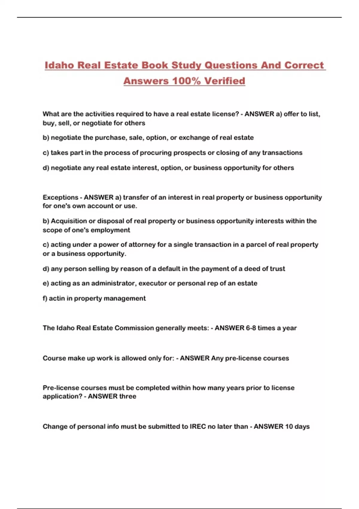 Idaho Real Estate Book Study Questions And Correct Answers 100% Verified