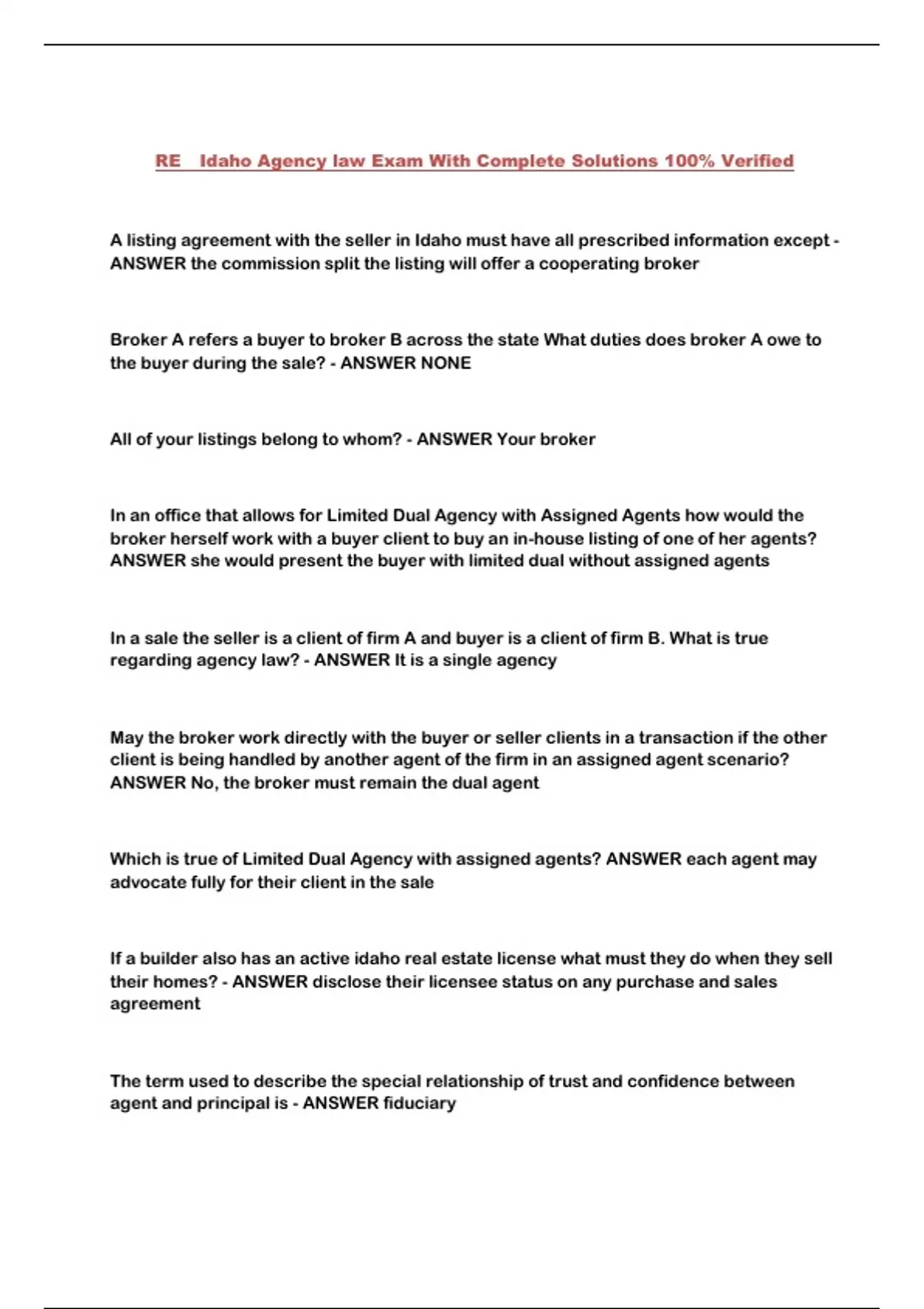 RE Idaho Agency law Exam With Complete Solutions 100% Verified