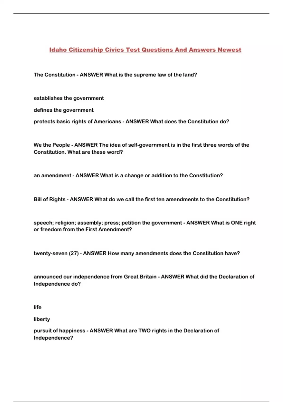 Idaho Citizenship Civics Test Questions And Answers Newest...