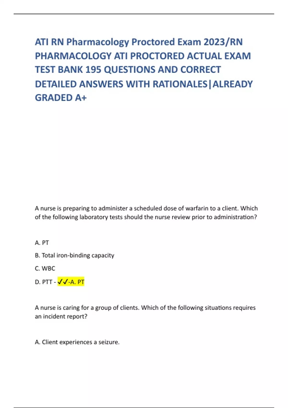ATI RN Pharmacology Proctored Exam 2023/RN TEST BANK 195QUESTIONS AND CORRECT DETAILED ANSWERS WITH RATIONALES|ALREADY PHARMACOLOGY ATI PROCTORED ACTUAL EXAM GRADED A+
