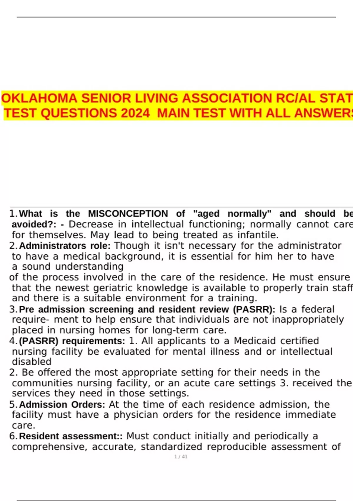 OKLAHOMA SENIOR LIVING ASSOCIATION STATE TEST QUESTIONS 2024 MAIN TEST WITH ALL