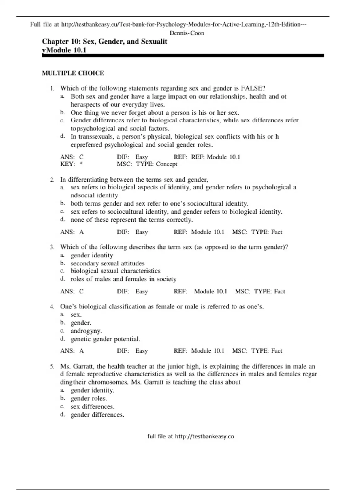 Test bank for psychology modules for active learning 12th edition dennis coon doc