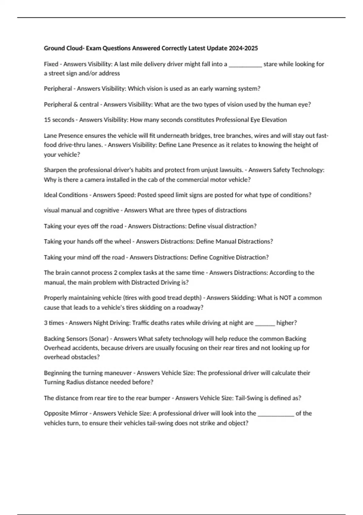 Ground Cloud- Exam Questions Answered Correctly Latest Update Fixed - Answers Visibility: A last mile delivery driver might fall into a __________ stare while looking for a street sign and/or address Peripheral - Answers Visibility: Which vision is used as an early warning system? Peripheral & central - Answers Visibility: What are the two types of vision used by the human eye? 15 seconds - Answers Visibility: How many seconds constitutes Professional Eye Elevation Lane Presence ensures the vehicle will fit underneath bridges, tree branches, wires and will stay out fast-food drive-thru lanes. - Answers Visibility: Define Lane Presence as it relates to knowing the height of your vehicle? Sharpen the professional driver's habits and protect from unjust lawsuits. - Answers Safety Technology: Why is there a camera installed in the cab of the commercial motor vehicle? Ideal Conditions - Answers Speed: Posted speed limit signs are posted for what type of conditions? visual manual and cognitive - Answers What are three types of distractions Taking your eyes off the road - Answers Distractions: Define visual distraction? Taking your hands off the wheel - Answers Distractions: Define Manual Distractions? Taking your mind off the road - Answers Distractions: Define Cognitive Distraction? The brain cannot process 2 complex tasks at the same time - Answers Distractions: According to the manual, the main problem with Distracted Driving is? Properly maintaining vehicle (tires with good tread depth) - Answers Skidding: What is NOT a common cause that leads to a vehicle's tires skidding on a roadway? 3 times - Answers Night Driving: Traffic deaths rates while driving at night are ______ higher? Backing Sensors (Sonar) - Answers What safety technology will help reduce the common Backing Overhead accidents, because drivers are usually focusing on their rear tires and not looking up for overhead obstacles? Beginning the turning maneuver - Answers Vehicle Size: The professional driver will calculate their Turning Radius distance needed before? The distance from rear tire to the rear bumper - Answers Vehicle Size: Tail-Swing is defined as? Opposite Mirror - Answers Vehicle Size: A professional driver will look into the ___________ of the vehicles turn, to ensure their vehicles tail-swing does not strike and object? Behind the vehicle and the area in front of the passenger side front bumper - Answers Vehicle Size: The two main blind spots around commercial vehicles consist of the distance ________ and the area ____________? 34' - Answers Vehicle Size: What is the length of the largest P & D Vehicle, a standard 26ft Straight Truck? 13'6" - Answers What is the maximum height of a standard 26ft Straight Truck? The distance required to safely stop your vehicle AND the vehicle behind you - Answers Define stopping distance? Thinking distance + breaking distance= stopping distance - Answers Vehicle Size: Which is the correct Stopping Distance Formula? Parking Technique Accidents - Answers Vehicle Size: What continues to be the leading cause of accidents in the Last Mile Delivery Industry? Always be able to drive Forward after returning from your delivery or pick-up - Answers Parking Technique: What is the simple summary to park your vehicle properly? Limit Backing, Back Now & Limit the Total Distance - Answers Parking Technique: Name the 3 simple to Follow to be able to ALWAYS pull FORWARD Allows you to decrease the distance of your backing maneuver - Answers Parking Technique: Under the Professional Backing to a Dock Techniques, what is one benefit of Swooping Down Towards the Dock? Driver's Side Backing Maneuver - Answers Parking Technique: Under the Professional Backing to a Dock Techniques, what type of backing maneuver provides for the best visibility? Use the horn & flashers - Answers Parking Technique: Under the Professional Backing to a Dock Techniques, what should the driver do before reverse is engaged? In order to keep fatigues drivers off the roadways - Answers DOT Regulations: Why are Hours of Service Rules in place? Anytime the driver is preforming a job-related task (i,e. punching-in for work) - Answers Dot Regulations: Define On-Duty? 10 hours - Answers Dot Regulations: How many hours must a driver spend resting or OFF-Duty, before starting to drive a commercial motor vehicle? 14th - Answers DOT Regulations: Without using the 16 Hour Rule, a driver may NOT drive beyond the _____________ consecutive hour? This "clock" does not stop even if the driver changes to OFF-DUTY to take a lunch or nap. 1 DOT number, one for the entire company - Answers DOT Regulations: How many DOT Numbers does FXG operate under? FXG is evaluated on the performance of the 165,000+ drivers and the mechanical condition of the 89,000+ vehicles. - Answers DOT Regulations: How does only having One DOT Number effect FXG and its daily operations 15% - Answers Railroad Crossing: What percentage of railroad accidents happen at properly functioning automatic warning devices 47% - Answers Seat Belts: According to the NHTSA, National Highway Traffic Safety Administration, what percentage of people were killed in vehicle accidents because they did not wear a seatbelt? Not wearing a seatbelt and only trusting airbags/Improperly wearing seatbelt. All answers are correct - Answers Seat Belts: Name ways that a seatbelt and/or airbags could harm or even kill