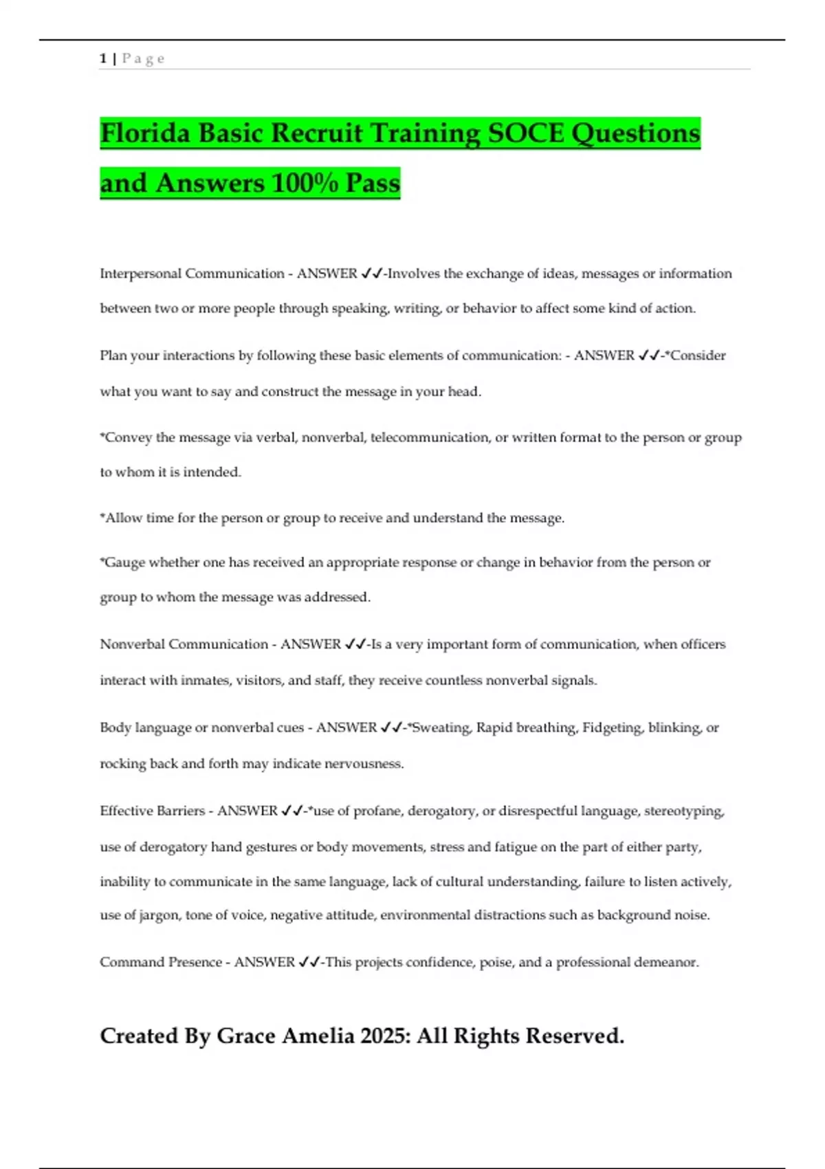 Florida Basic Recruit Training SOCE Questions and Answers 100% Pass Interpersonal Communication - ANSWER -Involves the exchange of ideas, messages or information between two or more people through speaking, writing, or behavior to affect some kind of action. Plan your interactions by following these basic elements of communication: - ANSWER -*Consider what you want to say and construct the message in your head. *Convey the message via verbal, nonverbal, telecommunication, or written format to the person or group to whom it is intended. *Allow time for the person or group to receive and understand the message. *Gauge whether one has received an appropriate response or change in behavior from the person or group to whom the message was addressed. Nonverbal Communication - ANSWER -Is a very important form of communication, when officers interact with inmates, visitors, and staff, they receive countless nonverbal signals. Body language or nonverbal cues - ANSWER -*Sweating, Rapid breathing, Fidgeting, blinking, or rocking back and forth may indicate nervousness. Effective Barriers - ANSWER -*use of profane, derogatory, or disrespectful language, stereotyping, use of derogatory hand gestures or body movements, stress and fatigue on the part of either party, inability to communicate in the same language, lack of cultural understanding, failure to listen actively, use of jargon, tone of voice, negative attitude, environmental distractions such as background noise. Command Presence - ANSWER -This projects confidence, poise, and a professional demeanor. 2 | P a g e Created By Grace Amelia 2025: All Rights Reserved. Verbal Command - ANSWER -Is an authoritative statement used to direct, influence, or give orders to a person or group. Courtesy - ANSWER -is being respectful when interacting with others and treating them in a dignified manner, regardless of their status, race, gender, appearance, or behavior. Active Listening - ANSWER -Requires giving full attention to what is being said and taking time to understand the message without interruptions. Secured Storage Areas - ANSWER -include an armory, a mini arsenal, caustic chemicals locker, master tool room, a tool cage, an exterior building, or any designated room within the facility. Nonlethal weapons - ANSWER -Electronic control devices, impact weapons, and chemical agents such as Oleoresin Capsicum (OC) Spray Hazardous Matierals - ANSWER -Are substances (solids, liquids, or gases) that when released may be capable of causing harm to people, the environment, and property. Hazardous Materials Include: - ANSWER -*Acids *Bleach *Insecticides *Glue *Gasoline MSDS - ANSWER -Material Safety Data Sheets OSHA - ANSWER -Occupational Safety and Health Administration Sensitive Supplies - ANSWER -refers to supplies used throughout the facility for health, sanitation, or housing maintenance . 3 | P a g e Created By Grace Amelia 2025: All Rights Reserved. Common sensitive supplies include - ANSWER -medical equipment , medicine, industrial strength cleaners, or other substances used for facility maintenance. Security Equipment - ANSWER -is defined as any item or technology used to enhance or maintain protection, and to ensure safety. Perimeter - ANSWER -is a secure area that surrounds a facility and is an element of security. security inspections verify - ANSWER -unknown security check verify - ANSWER -known photographing - ANSWER -943.052(2) F.S. Minimum security level - ANSWER -is for inmates considered low risk: those who have adjusted well to being incarcerated, have a minimal criminal history with no violent charges in their history, or are currently charged with a nonviolent crime. Medium security level - ANSWER -is for inmates considered moderate risk: those who have adjusted to being incarcerated in the past and have limited violence in their criminal history. Maximum security level - ANSWER -is for inmates considered high risk: those who have serious and violent felony charges pending or pose a threat to the safety of staff and security of the facility. Community custody grade - ANSWER -refers to inmates who are eligible for placement at a community residential facility. Minimum custody grade - ANSWER -refers to inmates who are eligible for outside work assignments but not for placement in a community residential center. Medium custody grade - ANSWER -refers to inmates who are eligible for placement at a work camp with a secure perimeter but who are not eligible for placement in an outside work assignment without armed supervision. 4 | P a g e Created By Grace Amelia 2025: All Rights Reserved. Close custody grade - ANSWER -refers to inmates who must be maintained within an armed perimeter or under direct, armed supervision when outside a secure perimeter. Maximum custody grade - ANSWER -refers to inmates who are sentenced to death. Traditional STG - ANSWER -have a documented history, a written set of laws or codes, and can have an organizational structure. Examples: Latin Kings, Bloods, Crips, Aryan Brotherhood, Ku Klux Klan, MS-13. Non-Traditional/Hybrid STGs - ANSWER -without laws or code, but still have an organizational structure structure. Some examples include Haitian STGs, Jamaican Posse, Asian Pride, and Taking Over Your Shit (TOYS) Transitional STG - ANSWER -members are individuals or a group of criminal gang members that come to prison and realign themselves with traditional and non-traditional STGs, or they can hybrid STG members recruited by larger, traditional STGs.
