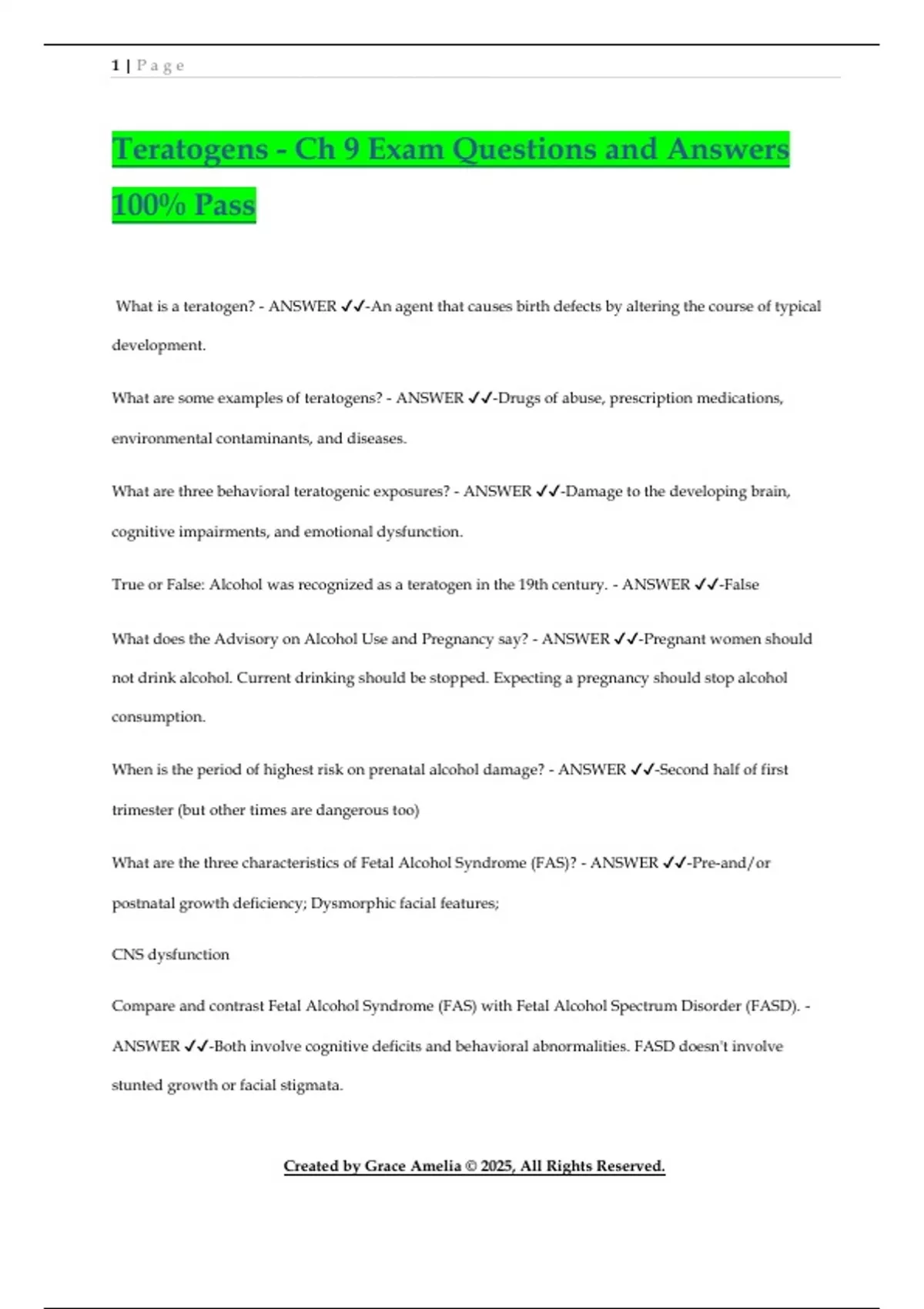 Teratogens - Ch 9 Exam Questions and Answers 100% Pass What is a teratogen? - ANSWER -An agent that causes birth defects by altering the course of typical development. What are some examples of teratogens? - ANSWER -Drugs of abuse, prescription medications, environmental contaminants, and diseases. What are three behavioral teratogenic exposures? - ANSWER -Damage to the developing brain, cognitive impairments, and emotional dysfunction. True or False: Alcohol was recognized as a teratogen in the 19th century. - ANSWER -False What does the Advisory on Alcohol Use and Pregnancy say? - ANSWER -Pregnant women should not drink alcohol. Current drinking should be stopped. Expecting a pregnancy should stop alcohol consumption. When is the period of highest risk on prenatal alcohol damage? - ANSWER -Second half of first trimester (but other times are dangerous too) What are the three characteristics of Fetal Alcohol Syndrome (FAS)? - ANSWER -Pre-and/or postnatal growth deficiency; Dysmorphic facial features; CNS dysfunction Compare and contrast Fetal Alcohol Syndrome (FAS) with Fetal Alcohol Spectrum Disorder (FASD). - ANSWER -Both involve cognitive deficits and behavioral abnormalities. FASD doesn't involve stunted growth or facial stigmata.