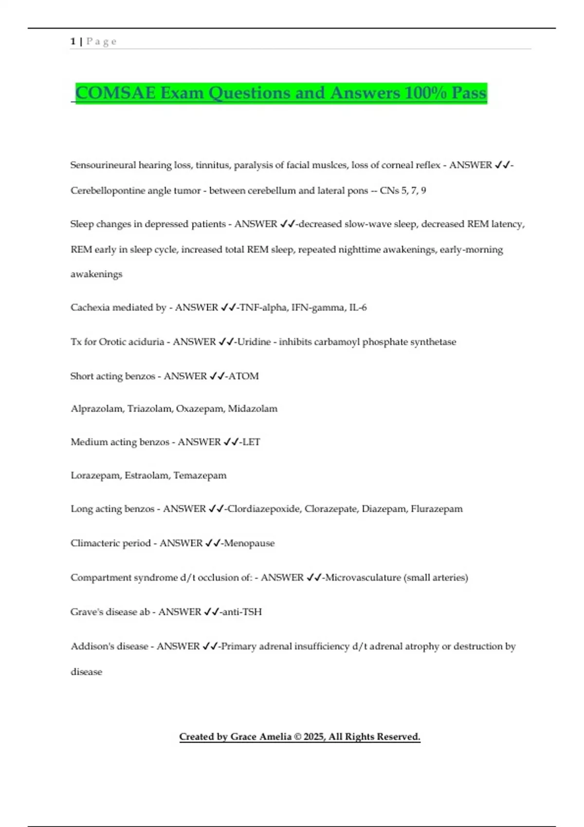 COMSAE Exam Questions and Answers 100% Pass Sensourineural hearing loss, tinnitus, paralysis of facial muslces, loss of corneal reflex - ANSWER - Cerebellopontine angle tumor - between cerebellum and lateral pons -- CNs 5, 7, 9 Sleep changes in depressed patients - ANSWER -decreased slow-wave sleep, decreased REM latency, REM early in sleep cycle, increased total REM sleep, repeated nighttime awakenings, early-morning awakenings Cachexia mediated by - ANSWER -TNF-alpha, IFN-gamma, IL-6 Tx for Orotic aciduria - ANSWER -Uridine - inhibits carbamoyl phosphate synthetase Short acting benzos - ANSWER -ATOM Alprazolam, Triazolam, Oxazepam, Midazolam Medium acting benzos - ANSWER -LET Lorazepam, Estraolam, Temazepam Long acting benzos - ANSWER -Clordiazepoxide, Clorazepate, Diazepam, Flurazepam Climacteric period - ANSWER -Menopause Compartment syndrome d/t occlusion of: - ANSWER -Microvasculature (small arteries) Grave's disease ab - ANSWER -anti-TSH Addison's disease - ANSWER -Primary adrenal insufficiency d/t adrenal atrophy or destruction by disease