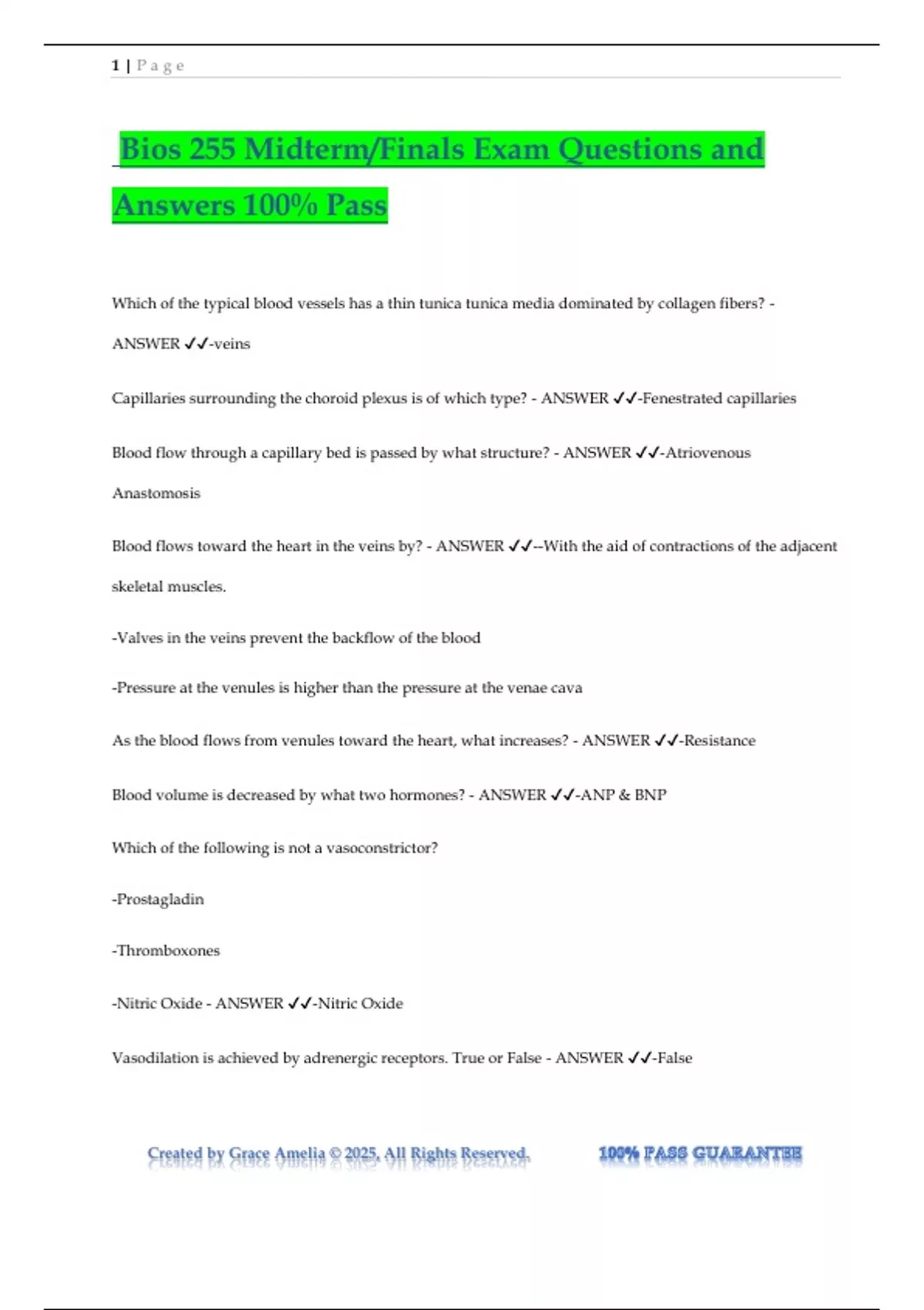 Bios 255 Midterm/Finals Exam Questions and Answers 100% Pass Which of the typical blood vessels has a thin tunica tunica media dominated by collagen fibers? - ANSWER -veins Capillaries surrounding the choroid plexus is of which type? - ANSWER -Fenestrated capillaries Blood flow through a capillary bed is passed by what structure? - ANSWER -Atriovenous Anastomosis Blood flows toward the heart in the veins by? - ANSWER --With the aid of contractions of the adjacent skeletal muscles. -Valves in the veins prevent the backflow of the blood -Pressure at the venules is higher than the pressure at the venae cava As the blood flows from venules toward the heart, what increases? - ANSWER -Resistance Blood volume is decreased by what two hormones? - ANSWER -ANP & BNP Which of the following is not a vasoconstrictor? -Prostagladin -Thromboxones -Nitric Oxide - ANSWER -Nitric Oxide Vasodilation is achieved by adrenergic receptors. True or False - ANSWER -False 2 | P a g e Created by Grace Amelia © 2025, All Rights Reserved. Baroreceptors are found in what sinus? - ANSWER -Carotid Sinuses Which of the typical blood vessels has thick tunica media dominated by smooth muscle cells and elastic fibers? - ANSWER -Arteries Femoral artery is a type of what artery? - ANSWER -Muscular Artery Capillaries that have a complete lining are called what? - ANSWER -Continuous Capillaries Blood flow through a capillary is regulated by what? - ANSWER -Precapillary Sphincter As the blood flows from the aorta towards the cappilaries what increases? - ANSWER -Resistance Pressure gradient of water causes osmosis. True or False - ANSWER -False Which of the following is NOT a vasodilator? - ANSWER -Prostagladin Venous reserve is used during extreme blood loss. True or False - ANSWER -True Chemoreceptors are found in what? - ANSWER -Aortic Bodies Venous valves allow blood to flow in BOTH directs. True or False. - ANSWER -False The normal heart sounds are caused by what? - ANSWER -The closure of the heart valves The left ventricular wall of the heart is much thicker than the right wall in order to do what? - ANSWER -Pump blood against a greater pressure Ventricular depolarization corresponds to what complex? - ANSWER -QRS Complex Blood within the pulmonary veins returns to the heart in what location? - ANSWER -Left Atrium When the heart rate is at 75, the duration of one cardiac cycle is how long? - ANSWER -0.8 seconds Cardiac muscle cells are like skeletal muscle cells in that they all have what? - ANSWER -Striation