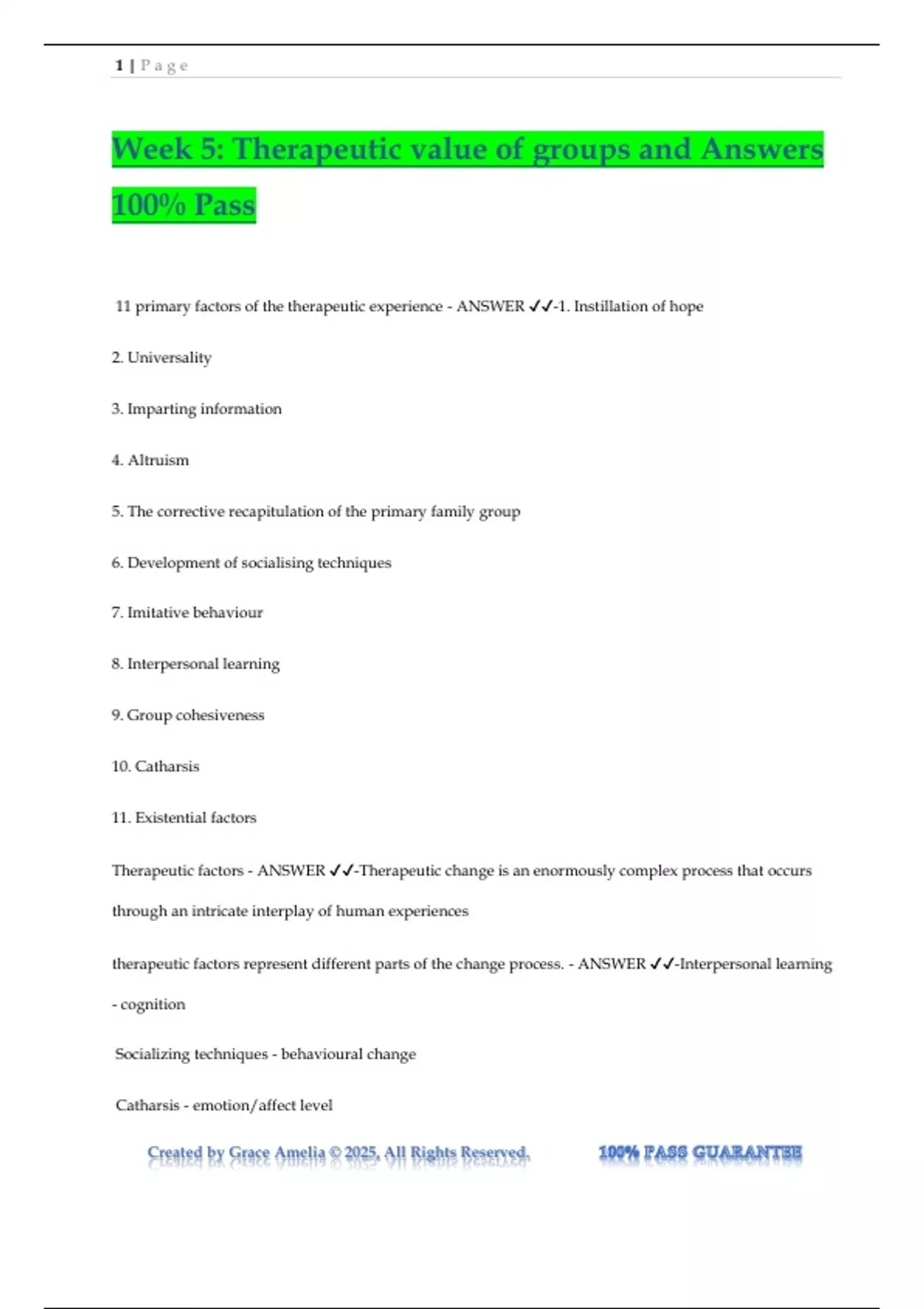 Week 5: Therapeutic value of groups and Answers 100% Pass 11 primary factors of the therapeutic experience - ANSWER -1. Instillation of hope 2. Universality 3. Imparting information 4. Altruism 5. The corrective recapitulation of the primary family group 6. Development of socialising techniques 7. Imitative behaviour 8. Interpersonal learning 9. Group cohesiveness 10. Catharsis 11. Existential factors Therapeutic factors - ANSWER -Therapeutic change is an enormously complex process that occurs through an intricate interplay of human experiences therapeutic factors represent different parts of the change process. - ANSWER -Interpersonal learning - cognition Socializing techniques - behavioural change Catharsis - emotion/affect level 2 | P a g e Created by Grace Amelia © 2025, All Rights Reserved. Cohesiveness - precondition for change 1. Instillation of hope - ANSWER -- The instillation and maintenance of hope is crucial in any psychotherapy. - Hope is required to keep clients in therapy - don't believe in something, it won't work. - Faith in a treatment can in itself be therapeutically effective à A high expectation of help before the start of therapy is significantly correlated with a positive therapy outcome. - Selection of diverse clients along the coping-collapse continuum. - A positive outcome à more likely when the client and therapist have similar expectations 2. universality - ANSWER -- Many individuals enter therapy with the thought that they are unique in their wretchedness. - To some extent this is true for all of us, but many clients, because of their extreme social isolation, have a heightened sense of uniqueness. - Their interpersonal difficulties stop them from being validated and accepted by others. - Disconfirmation of a client's feelings of uniqueness is a powerful source of relief. - Clients express great relief at discovering that others share the same problems. - consensual validity: Establishing consensus between observers about the validity or objectivity of an observation or perception - what we are going through is not that abnormal. o H.S. Sullivan: The process whereby patients/ clients compare their own feelings and responses to certain life experiences with the feelings and responses (behaviours) of other individuals who have had similar experiences. - Patients can experience heightened self-efficacy and confidence when they establish that others, who have 3 | P a g e Created by Grace Amelia © 2025, All Rights Reserved. had similar experiences, reacted similarly to those situations. 3. imparting information - ANSWER -1. Didactic Instruction 2. Direct advice 1. didactic instruction - ANSWER -- Many group therapy approaches have made use of psychoeducation (formal instruction) as an important part of the program. - NB! Learning takes place in a group environment. - Ideal context = one of partnership and collaboration. - These groups offer clear instruction about the nature of the client's illness or life situation and examine client's misperceptions and self-defeating responses to their illness. - Group settings are the best place to teach mindfulness- and meditation-based stress reduction approaches. - The first step towards control is the explanation of a phenomenon. 2. Direct advice - ANSWER -- Direct advice from members occur in every therapy group. - In dynamic interactional therapy groups, it is invariably part of the early life of the group and occurs with such regularity that it can be used to estimate a group's age. - Advice-giving may reflect a resistance to more intimate engagement in which the group members attempt to manage relationships rather than to connect. - The process of giving advice, rather than the content of the advice, may be beneficial, implying and conveying mutual interest and caring. - Direct suggestion = the least effective form of advice. 4 | P a g e Created by Grace Amelia © 2025, All Rights Reserved. 4. Altruism - ANSWER -- Members gain through giving. - Many psychiatric patients beginning therapy are demoralised and possess a deep sense of having nothing of value to offer others. - Group therapy is the only therapy that offers clients the opportunity to benefit others. - Encourages role versatility - requiring clients to shift between roles of help receivers and help providers. 5. Corrective recapitulation of the primary family group - ANSWER -- Majority of clients who enter have a background of a highly unsatisfactory experience in their 1st and most important group primary family. - A therapy group resembles a family. - Enactment of familial patterns of interaction Family conflicts relived correctively: Re-exposure without repair worsens situations Resolving unfinished business: Unfreezing of rigid / fixed roles 6. Development of socializing techniques - ANSWER -- Social learning is the development of basic social skills. o Therapeutic factors that operate in all therapy groups. - For individuals lacking intimate relationships, the group is the f