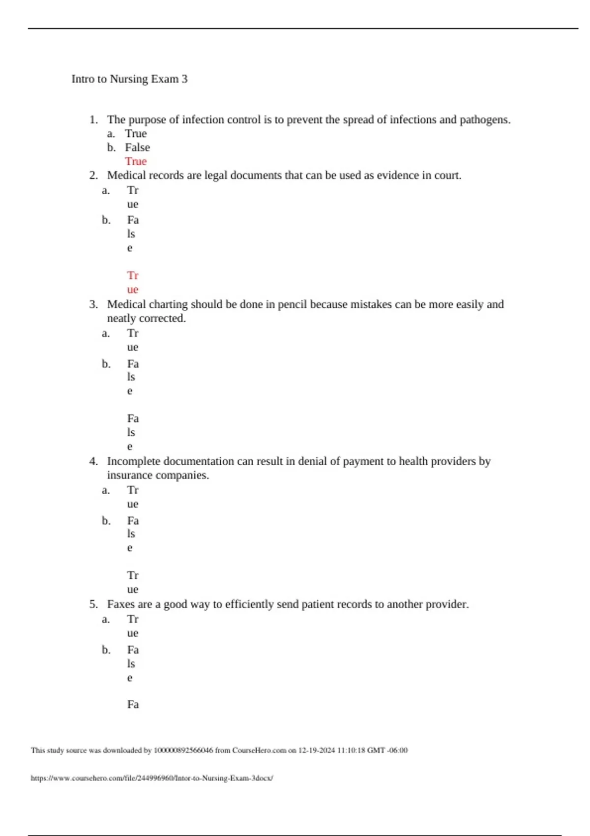 Intro to Nursing Exam 3 1. The purpose of infection control is to prevent the spread of infections and pathogens. a. True b. False True 2. Medical records are legal documents that can be used as evidence in court. a. Tr ue b. Fa ls e Tr ue 3. Medical charting should be done in pencil because mistakes can be more easily and neatly corrected. a. Tr ue b. Fa ls e Fa ls e 4. Incomplete documentation can result in denial of payment to health providers by insurance companies. a. Tr ue b. Fa ls e Tr ue 5. Faxes are a good way to efficiently send patient records to another provider. a. Tr ue b. Fa 6. Infectious diseases are caused by the decrease in growth of pathogens. a. True b. False 7. An epidemic is the widespread occurrence of infectious disease globally. a. True b. False 8. Signs of a generalized systemic infection is fever, vomiting and fatigue. a. True b. False True 9. Mr. Jones was experiencing redness, swelling and pain from his systemic infection. a. True b. False 10. Aerobic microorganisms need oxygen to live. a. True b. False True 11. Anaerobic microorganisms need oxygen to live. a. True b. False 12. Bacteria is only made up of single and chain clusters. a. True b. False False 13. Yeast are multicellular organisms. a. True b. False False 14. One way to identify the type of bacteria is by gram staining. a. True b. False 15. Fungi are a small animal that can only be seen under a microscope. a. True b. False False 16. The chain of infection must be kept intact to stop an infection from being transmitted. a. True 17. Class A fire extinguishers should never be used on fires that involve flammable liquids. a. True b. False 18. In the event of a fire, a hot door should be opened if it is the only escape route. a. True b. False 19. Chemicals should never be stored near a heat source or in direct sunlight. a. True b. False 20. Workplace violence is lower in health care settings than in other work settings. a. True b. False 21. Identify the five pathogenic microorganisms. (select all that apply) a. Bacteria b. Algae c. Fungi d. Protozoa e. Rickettsia f. Mold g. Virus ) 22. The smallest type of microbes is: a. Viruses b. Rickettsia c. Bacteria d. Protozoa 23. Which of the following would cause athlete’s foot? a. Worm b. Virus c. Fungi d. Yeast 24. The body has _______to defend the respiratory tract. a. Meninges b. Leukocytes c. Agent d. Cilia 25. Which of the following is NOT correct in the link of the chain of infection? b. Reservoir host c. Portal of exit d. Route of diffusion e. Portal of entry f. Susceptible host Ans: D 26. Identify the meaning of RACE in a fire (Answer is 5 choices). a. Remove b. Activate alarm c. Continue d. Extinguish or e. Contain f. Exit or g. Evacuate or 27. When using a fire extinguisher, at which part of the fire should the nozzle be aimed? a. Top section of the flames b. Middle section of the flames c. The base of the flames d. Up and down the height of the flames Ans: C 28. What is the advantage of using an ABC type of fire extinguisher? a. It is the easiest to operate b. It does not leave a skin-irritating residue. c. It extinguishes fires the most quickly. d. It can be used on all types of fires. 29. Which is the correct way to document a patient’s statement about symptoms experienced? a. Write direct quotes and enclose the entry in quotation marks. b. Write the statement in your own words. c. Note the statement in a shortened form, using standard abbreviations. d. List the symptoms, using correct medical terminology. 30. How should the health care professional select appropriate abbreviations to use in written documentation? a. Create personal abbreviations that are clear. b. Refer to a standard medical dictionary. c. Use those learned in medical terminology courses. d. Follow facility policies. Ans: D 31. Which of the following personnel may write progress notes that are included in the patient’s official medical record? b. Only nurses c. Only physicians and nurses d. Any health care professional who provides a direct service to the patient 32. Which of the following is a purpose for medical documentation? a. Prevents malpractice lawsuits b. Prevents cost overruns c. Communicates directly with the patient d. Helps ensure compliance with regulatory agencies 33. Which of the following items would be included in the personal history? a. Allergies b. Smoking history c. Family tendency for problems d. Use of illegal drugs Ans: A 34. Which order is most frequently used for conducting complete physical examinations? a. From head to toe b. From trunk to arms and legs c. From feet to head d. From arms and legs to trunk 35. Which of the following is the most fundamental skill on which to base good health care observational skills? a. Recognizing the signs of disease b. Understanding normal anatomy and physiology c. Learning diagnostic skills d. Knowing how to correctly read the patient’s chart 36. When a health care professional is noting the gait of a patient, what are they observing? a. Manner of walking b. Speech pattern c. How well they hear d. If they are hydrated Ans: A 37. When working with patients who have orthostatic hypotension, it is important to: a. make sure they take blood pressure medication. b. test for apical‒radial deficit. c. check their blood pressure frequently. . 38. What instrument is used to measure a patient’s blood pressure? a. A Blood Pressure Cuff b. A Monitor c. Sphygmomanometer d. Sphygmamanoscope 39. What does it mean when a patient reports his pain dropping from 8 to 2 after receiving pain medication? a. The medication has been effective. b. The patient did not need the medication. c. The medication regimen needs to be reevaluated. d. The pain cannot be controlled. 40. Why are electrical fires especially hazardous? a. There is the danger of electrocution. b. They burn and spread more quickly. c. They are difficult to put out. d. Fire extinguishers cannot be used on them. Ans: A 41. In the event of a fire in which smoke is p