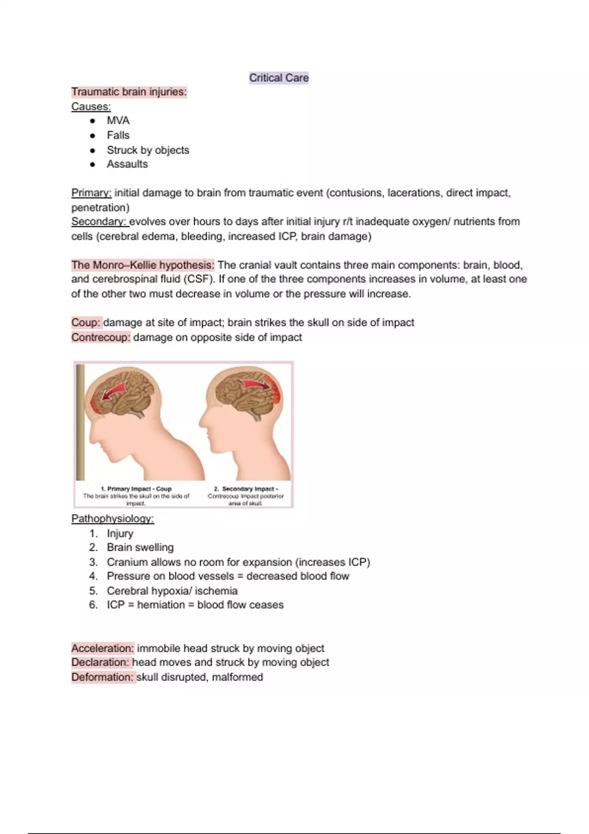 Coup: damage at site of impact; brain strikes the skull on side of impact