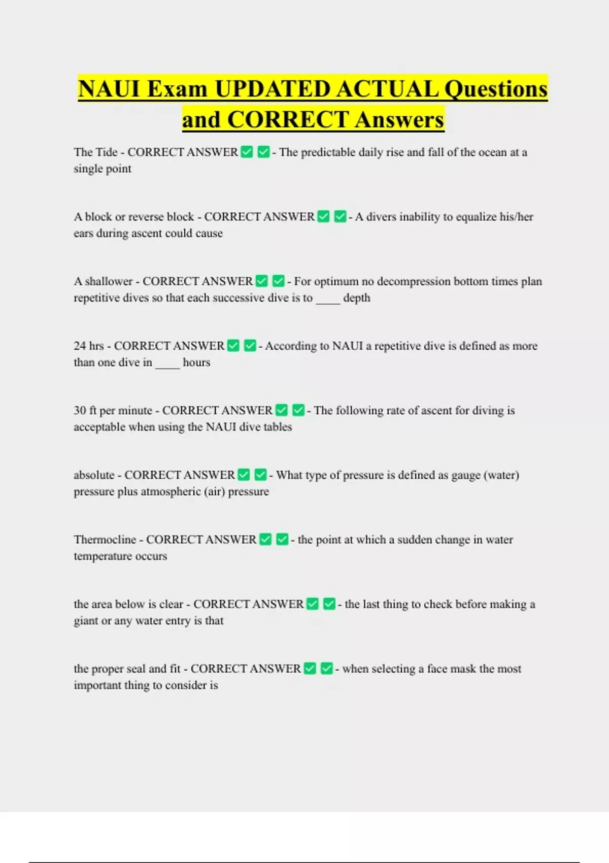 NAUI Exam UPDATED ACTUAL Questions and CORRECT Answers The Tide - CORRECT ANSWER - The predictable daily rise and fall of the ocean at a single point A block or reverse block - CORRECT ANSWER - A divers inability to equalize his/her ears during ascent could cause A shallower - CORRECT ANSWER - For optimum no decompression bottom times plan repetitive dives so that each successive dive is to ____ dept