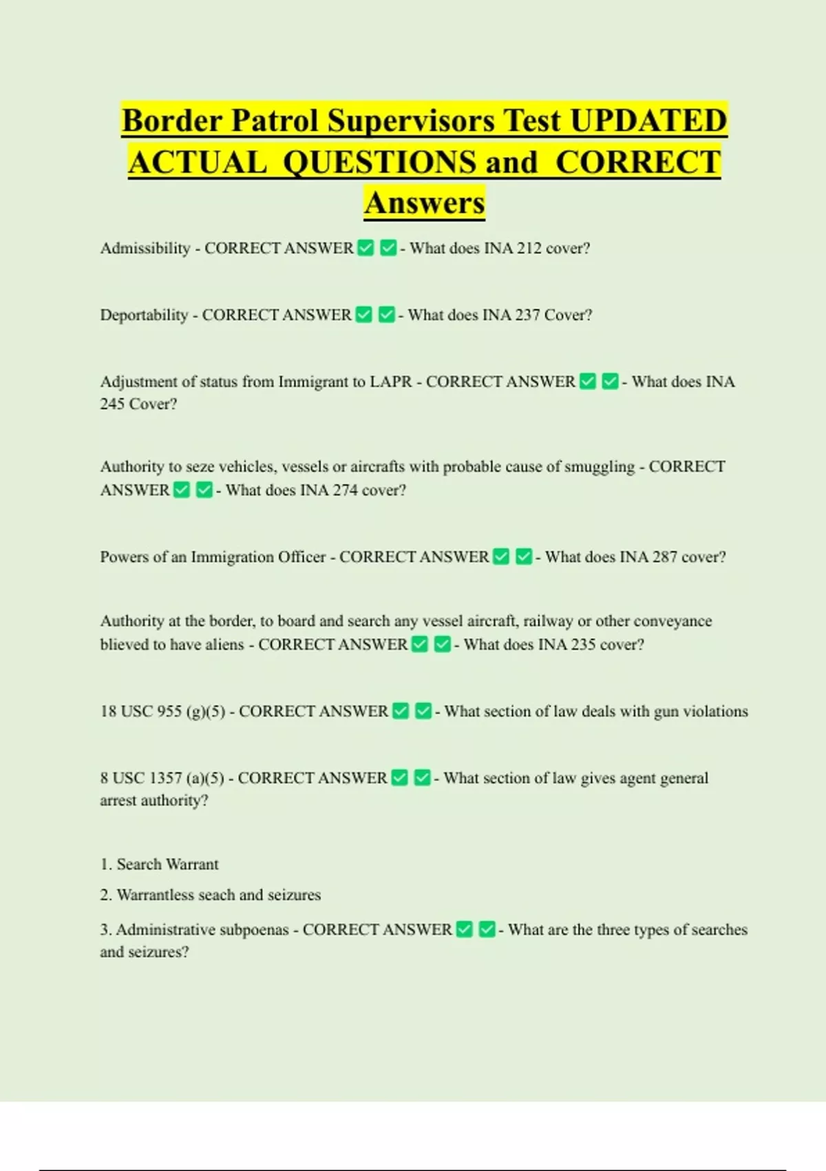 Border Patrol Supervisors Test UPDATED ACTUAL QUESTIONS and CORRECT Answers Admissibility - CORRECT ANSWER - What does INA 212 cover? Deportability - CORRECT ANSWER - What does INA 237 Cover? Adjustment of status from Immigrant to LAPR - CORRECT ANSWER - What does INA 245 Cover