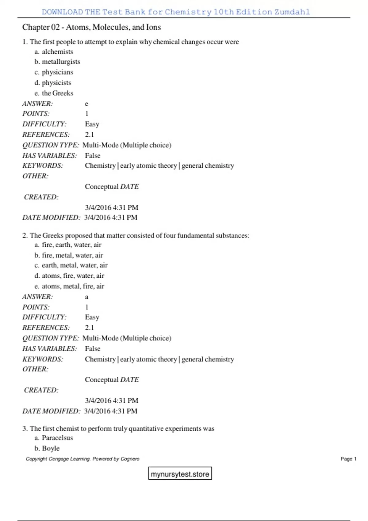 , DOWNLOAD THE Test Bank for Chemistry 10th Edition Zumdahl