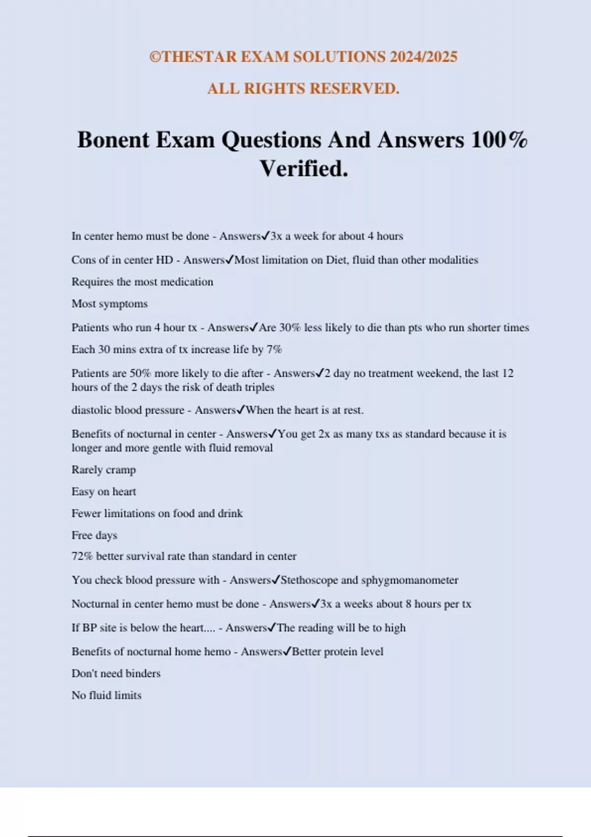 ©THESTAR EXAM SOLUTIONS 2024/2025 ALL RIGHTS RESERVED. Bonent Exam Questions And Answers 100% Verified. In center hemo must be done - Answers3x a week for about 4 hours Cons of in center HD - AnswersMost limitation on Diet, fluid than other modalities Requires the most medication Most symptoms Patients who run 4 hour tx - AnswersAre 30% less likely to die than pts who run shorter times Each 30 mins extra of tx increase life by 7% Patients are 50% more likely to die after - Answers2 day no treatment weekend, the last 12 hours of the 2 days the risk of death triples diastolic blood pressure - AnswersWhen the heart is at rest. Benefits of nocturnal in center - AnswersYou get 2x as many txs as standard because it is longer and more gentle with fluid removal Rarely cramp Easy on heart Fewer limitations on food and drink Free days 72% better survival rate than standard in center You check blood pressure with - AnswersStethoscope and sphygmomanometer Nocturnal in center hemo must be done - Answers3x a weeks about 8 hours per tx If BP site is below the heart.... - AnswersThe reading will be to high Benefits of nocturnal home hemo - AnswersBetter protein level Don't need binders No fluid limits ©THESTAR EXAM SOLUTIONS 2024/2025 ALL RIGHTS RESERVED. Fewer symptoms Less heart damage Live as long as people who get a deceased kidney transplant If BP site is above the heart.... - AnswersThe reading will be to low Home hemo must be done - Answers3x a week 4-6 hours per tx Benefits of PD - AnswersCan do alone at home or work Only need 1-2weeks of training Allows for a more normal diet Allows pt to feel more normal peritonitis - Answersinflammation of the peritoneum, this can scar the peritoneum and make PD no longer possible, can be avoided by doing a sterile exchange 2 types of PD - AnswersContinuous ambulatory peritoneal dialysis (CAPD) Automated peritoneal dialysis (APD)- uses cycled at night done 8-10 hours during sleep During in center HD how much blood is outside of body at a time - Answers1/2 cup Short Daily Home Hemodialysis must be done - Answers5-6days a week for the 2.5-4 hour per tx a bp cuff that is too small or to loose will cause a - AnswersHigher reading Nocturnal home hemomust be done - AnswersAt home 3-7 nights a week 8 hours per tx A no cuff that is to big for a patients arm ... - AnswersLower reading Why would someone want to do more HD than standard? - AnswersLonger or more frequent HD is gentle and cause fewer symptoms and may help Pt live longer, home puts pt in charge peritoneal dialysis - Answersthe lining of the peritoneal cavity acts as the filter to remove waste from the blood through tiny blood vessels. Placed in abdomen and sometimes chest wall Dialysate sits in catheter for a few hours and excess water and waste flows from BV to the dialysate. The dialysate is then drained and replaced. (Exchange) Pt can use a cycle mahjne while they sleep Can also be done by hand 4xa day and can be done anywhere. ©THESTAR EXAM SOLUTIONS 2024/2025 ALL RIGHTS RESERVED. In dialysis patients the reason BP drops during or close to the end of tx is because - AnswersThe total blood volume drops, from the water removal regular respiration rate - Answers12-16 breaths per minute In dialysis patients water may enter the lungs due to water weight gains this can cause - AnswersSob or trouble breathing Payment for dialysis - AnswersMedicare pays for 80% of dialysis Medicare makes rules a clinic must follow to provide coverage of tax. Pt who don't have Medicare before CKD a pt must wait 3 months for it to cover in center but it will cover home-hemo right away. 2011 change how they pay for dialysis and created a "bundle" (composite rate, labs,drugs and home training) Quality Incentive Program - AnswersPay for performance, Cuts pay by 2% if measures aren't met. (Kt/v and hemoglobin) ESRD networks - AnswersOversees quality of care, 18 mostly nonprofit organizations. Renal physicians association(RPA) - Answers1993 nephrologist made first clinical practice guidelines, including minimum dose of HD , when to start and stop HD and care for kidney disease for pt not on HD National Kidney Foundation (NKF) - Answers1995, experts set guidelines for anemia, adequacy, and vascular access KDOQI - AnswersKidney Disease Outcomes Quality Initiative, improves care and outcomes of all people with kidney disease Dialysis Outcomes and Practice Pattern Study - DOPPS - AnswersHelp pts love longer by finding patterns incenter that can be changed to improve outcome state survey - AnswersAn inspection of the facility by state surveyors for compliance with rules and regulations of Medicare. If clinics don't follow they must make a plan of correction. Continuous Quality Improvement (CQI) - AnswersFinding problems and fixing them. 4 step process 4 steps of continuous quality improvement - Answersify the problem- collect data and figure out how to fix ze problem-see if there is a standard or guideline to fix it, look at patterns or trends of problem? 4.Plan,do,check,act- make a plan to fix, try plan, check results and make changes if needed