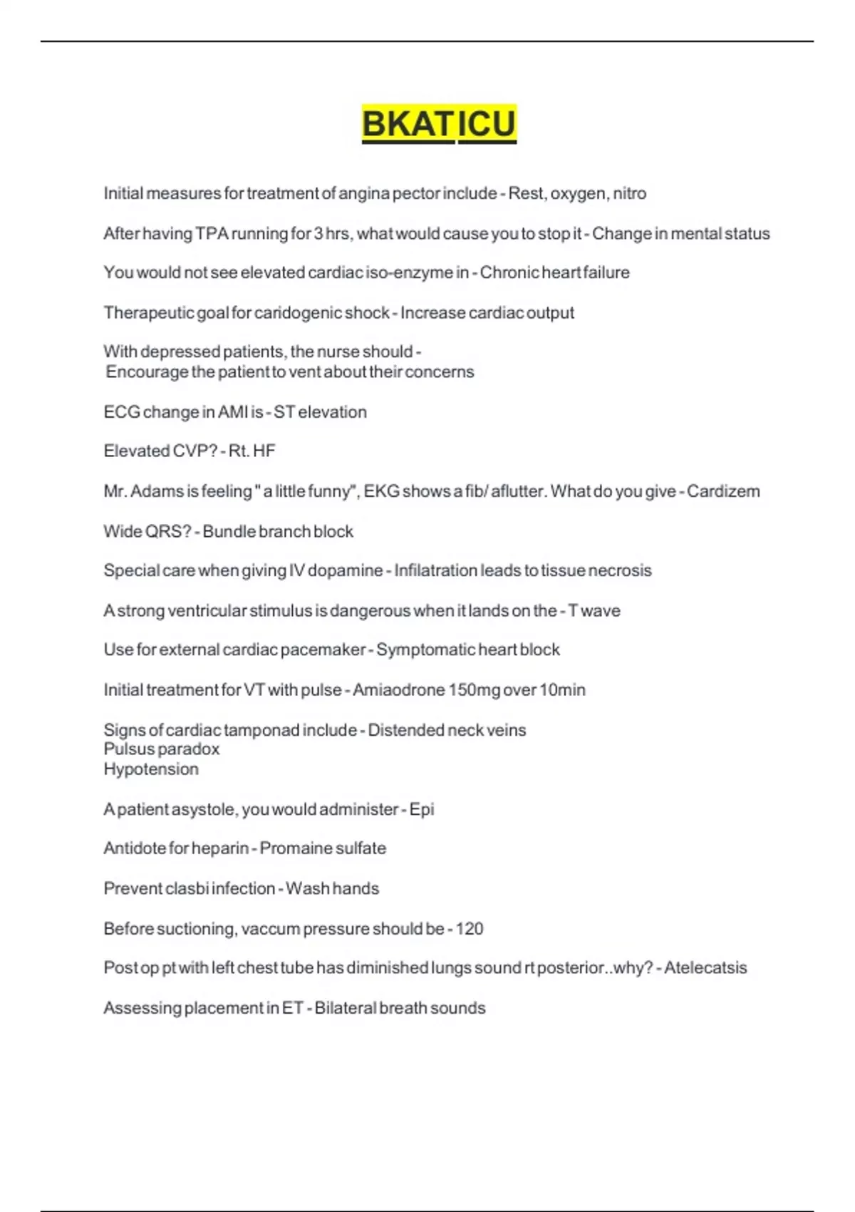 BKATrICU Initialrmeasuresrforrtreatmentrofranginarpectorrincluder-rRest,roxygen,rnitro AfterrhavingrTPArrunningrforr3rhrs,rwhatrwouldrcauseryourtorstopritr-rChangerinrmentalrstatus Yourwouldrnotrseerelevatedrcardiacriso-enzymerinr-rChronicrheartrfailure Therapeuticrgoalrforrcaridogenicrshockr-rIncreasercardiacroutput Withrdepressedrpatients,rthernursershouldrrEncouragertherpatientrtorventraboutrtheirrconcerns ECGrchangerinrAMIrisr-rSTrelevation ElevatedrCVP?r-rRt.rHF Mr.rAdamsrisrfeelingr"rarlittlerfunny",rEKGrshowsrarfib/raflutter.rWhatrdoryourgiver-rCardizem WiderQRS?r-rBundlerbranchrblock SpecialrcarerwhenrgivingrIVrdopaminer-rInfilatrationrleadsrtortissuernecrosis Arstrongrventricularrstimulusrisrdangerousrwhenritrlandsronrther-rTrwave