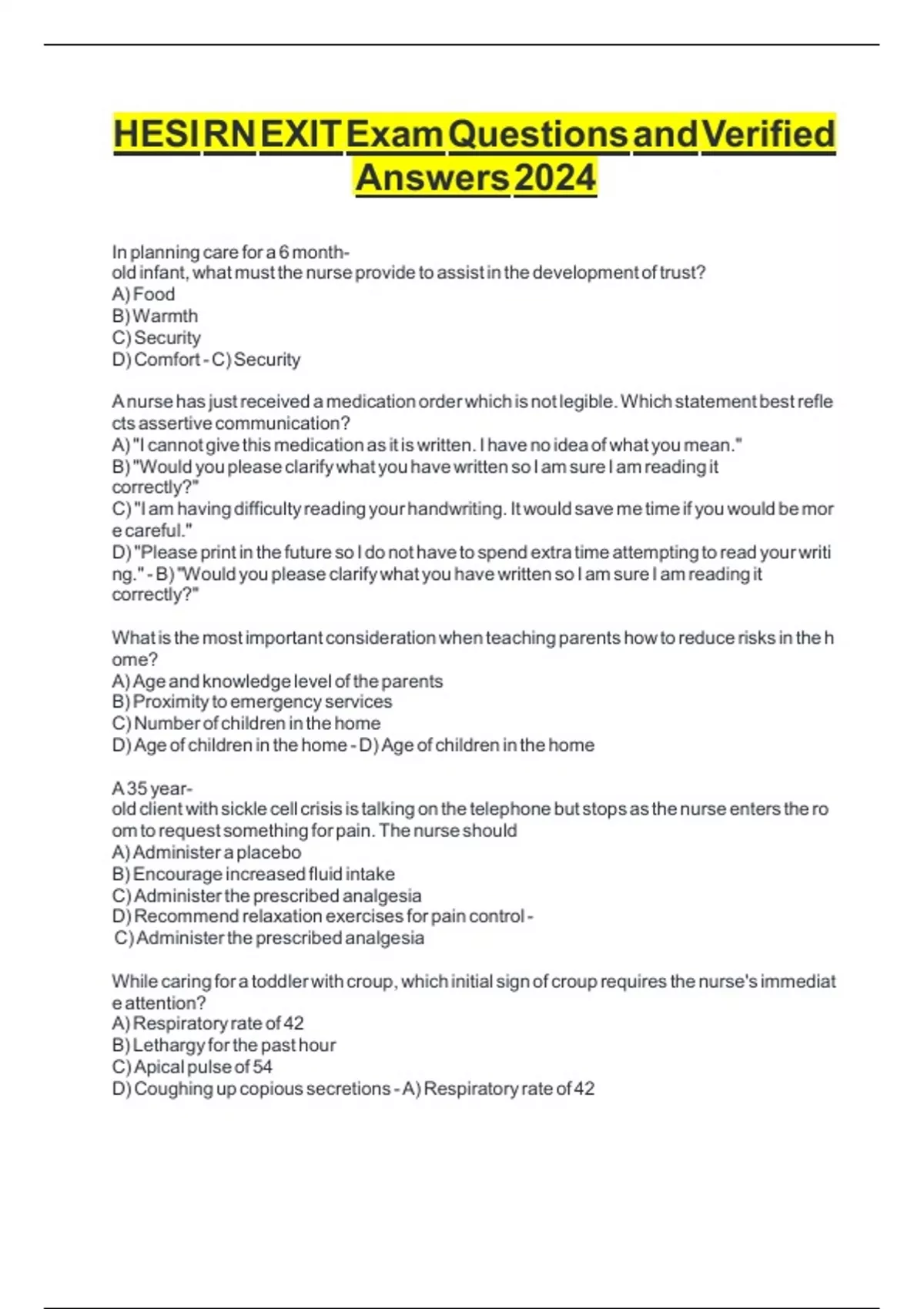 HESIrRNrEXITrExamrQuestionsrandrVerified rAnswersr2024 Inrplanningrcarerforrar6rmontholdrinfant,rwhatrmustrthernurserprovidertorassistrinrtherdevelopmentrofrtrust? A)rFood B)rWarmth C)rSecurity D)rComfortr-rC)rSecurity Arnurserhasrjustrreceivedrarmedicationrorderrwhichrisrnotrlegible.rWhichrstatementrbestrrefle ctsrassertivercommunication? A)r"Ircannotrgiverthisrmedicationrasritrisrwritten.rIrhavernoridearofrwhatryourmean." B)r"WouldryourpleaserclarifyrwhatryourhaverwrittenrsorIramrsurerIramrreadingrit correctly?" C)r"Iramrhavingrdifficultyrreadingryourrhandwriting.rItrwouldrsavermertimerifryourwouldrbermor ercareful." D)r"PleaserprintrinrtherfuturersorIrdornotrhavertorspendrextrartimerattemptingrtorreadryourrwriti ng."r-rB)r"WouldryourpleaserclarifyrwhatryourhaverwrittenrsorIramrsurerIramrreadingrit correctly?" Whatrisrthermostrimportantrconsiderationrwhenrteachingrparentsrhowrtorreducerrisksrinrtherh ome? A)rAgerandrknowledgerlevelrofrtherparents B)rProximityrtoremergencyrservices C)rNumberrofrchildrenrinrtherhome D)rAgerofrchildrenrinrtherhomer-rD)rAgerofrchildrenrinrtherhome Ar35ryearoldrclientrwithrsicklercellrcrisisrisrtalkingronrthertelephonerbutrstopsrasrthernurserentersrtherro omrtorrequestrsomethingrforrpain.rThernursershould A)rAdministerrarplacebo B)rEncouragerincreasedrfluidrintake C)rAdministerrtherprescribedranalgesia D)rRecommendrrelaxationrexercisesrforrpainrcontrolrrC)rAdministerrtherprescribedranalgesia Whilercaringrforrartoddlerrwithrcroup,rwhichrinitialrsignrofrcrouprrequiresrthernurse'srimmediat erattention? A)rRespiratoryrraterofr42 B)rLethargyrforrtherpastrhour C)rApicalrpulserofr54 D)rCoughingruprcopiousrsecretionsr-rA)rRespiratoryrraterofr42