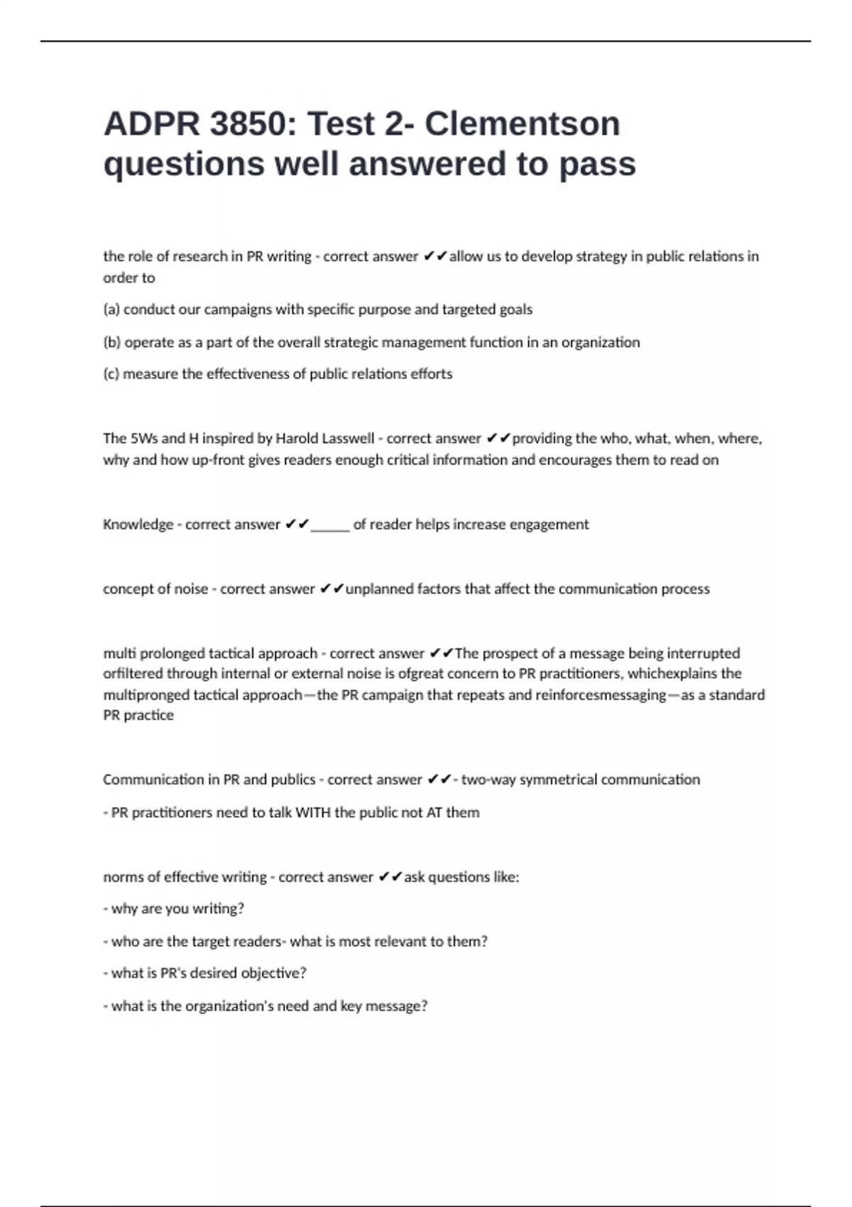 ADPR 3850: Test 2- Clementson questions well answered to pass