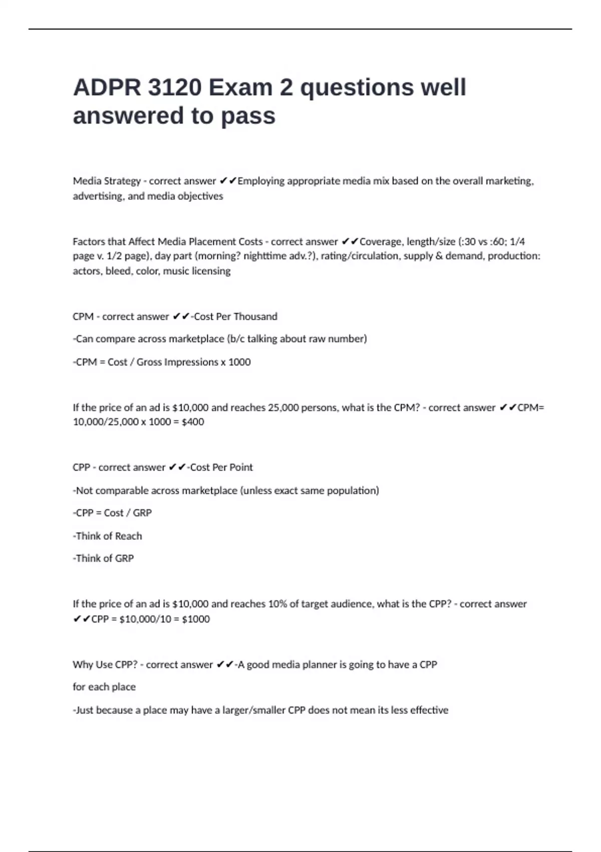 -10,061 (000) Viewers - correct answer ✔✔CPM = Cost / Gross Impressions x 1000