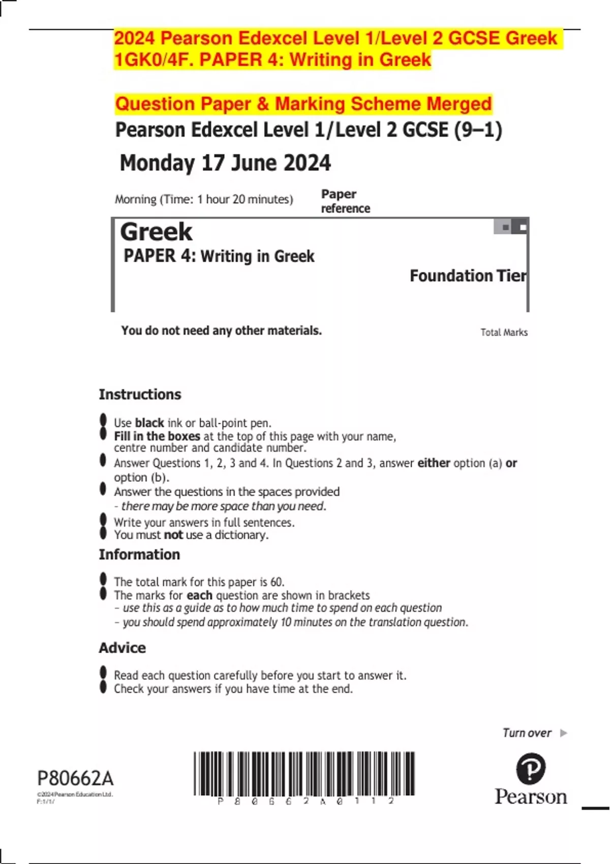 2024 Pearson Edexcel Level 1/Level 2 GCSE Greek 1GK0/4F. PAPER 4: Writing in Greek Question Paper & Marking Scheme Merged Pearson Edexcel Level 1/Level 2 GCSE (9–1) Monday 17 June 2024 Morning (Time: 1 hour 20 minutes)
