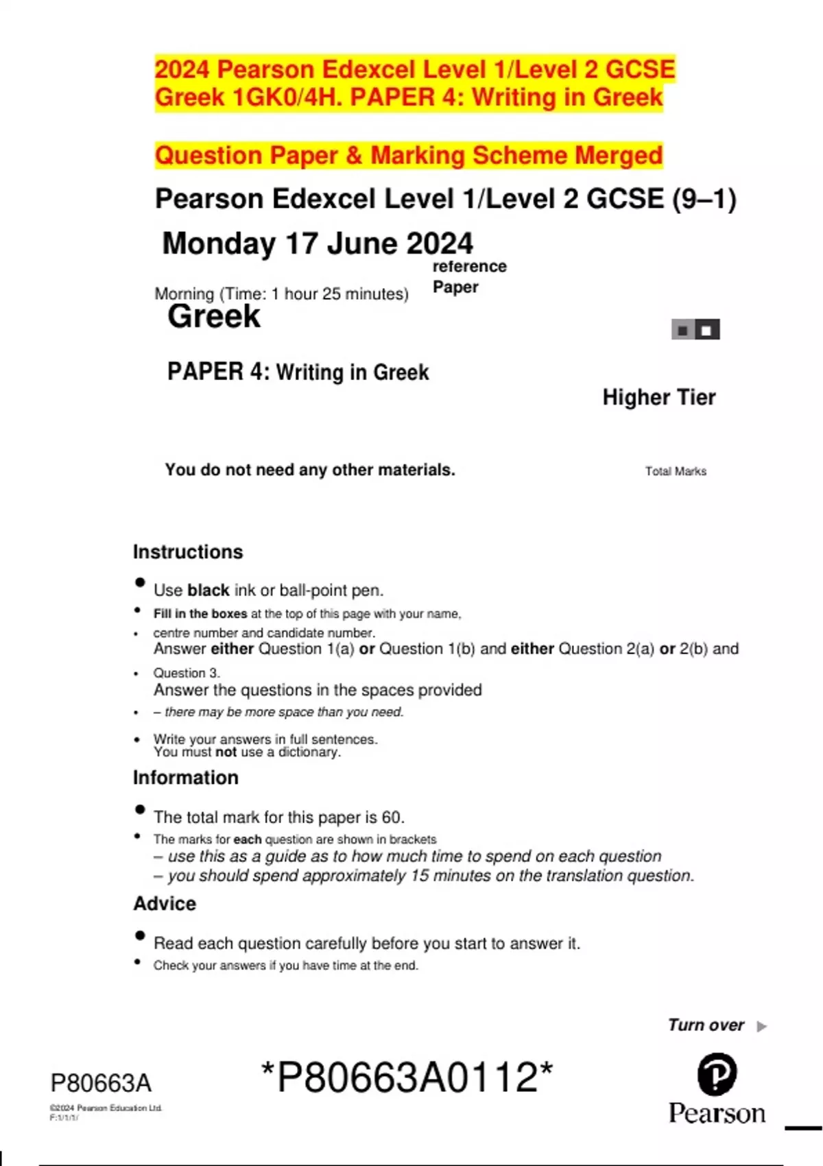 Greek 1GK0/4H. PAPER 4: Writing in Greek
