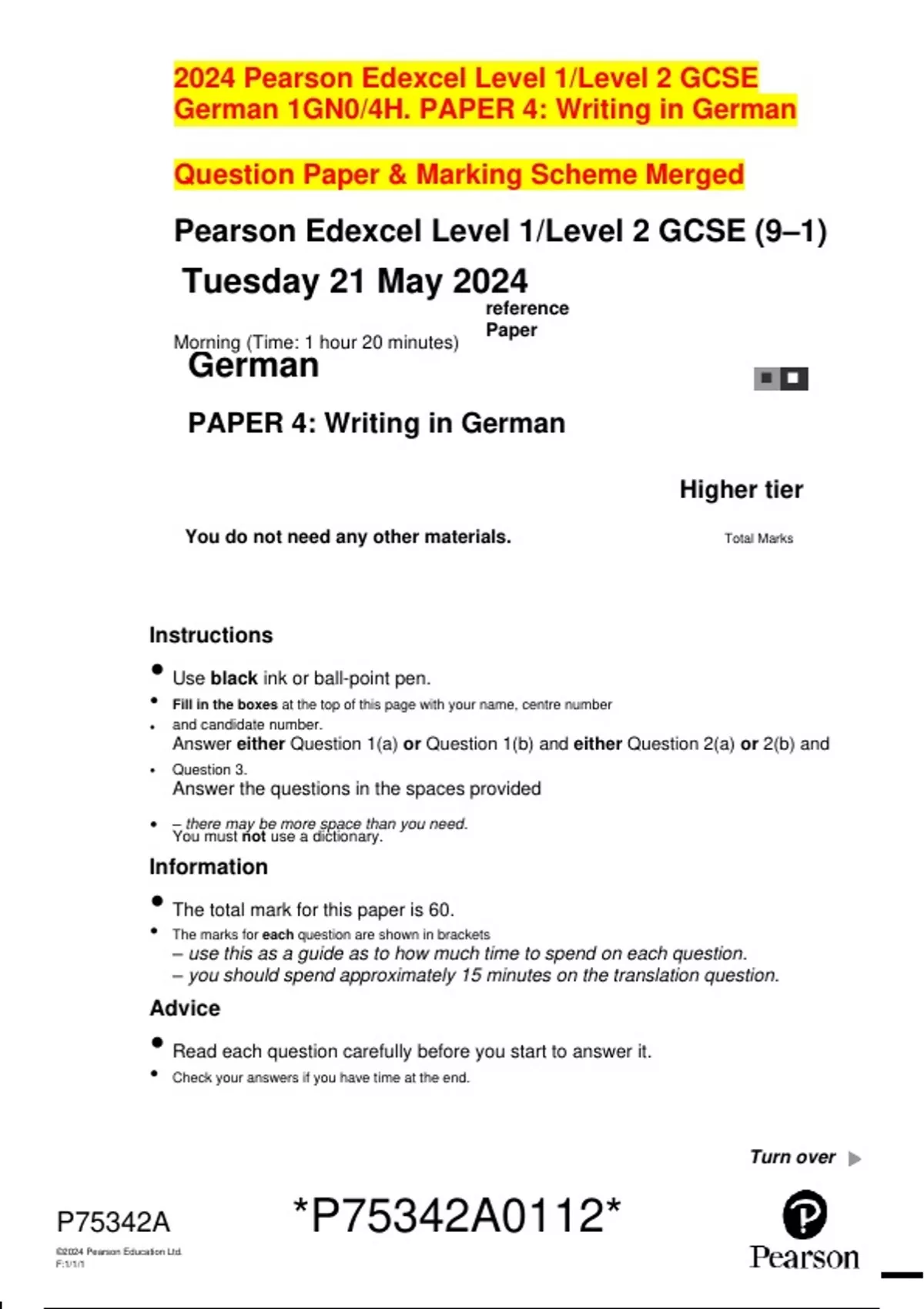 2024 Pearson Edexcel Level 1/Level 2 GCSE German 1GN0/4H. PAPER 4: Writing in German Question Paper & Marking Scheme Merged Pearson Edexcel Level 1/Level 2 GCSE (9–1)