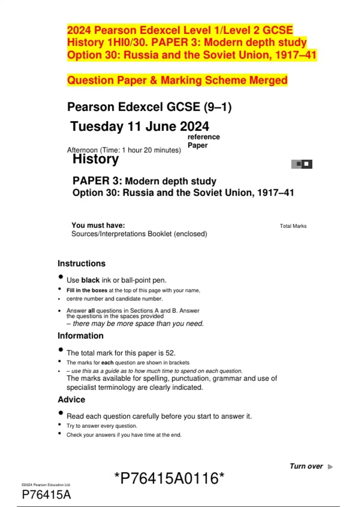 2024 Pearson Edexcel Level 1/Level 2 GCSE History 1HI0/30. PAPER 3: Modern depth study Option 30: Russia and the Soviet Union, 1917–41 Question Paper & Marking Scheme Merged Pearson Edexcel GCSE (9–1) Tuesday 11 June 2024 reference 1HI0/30