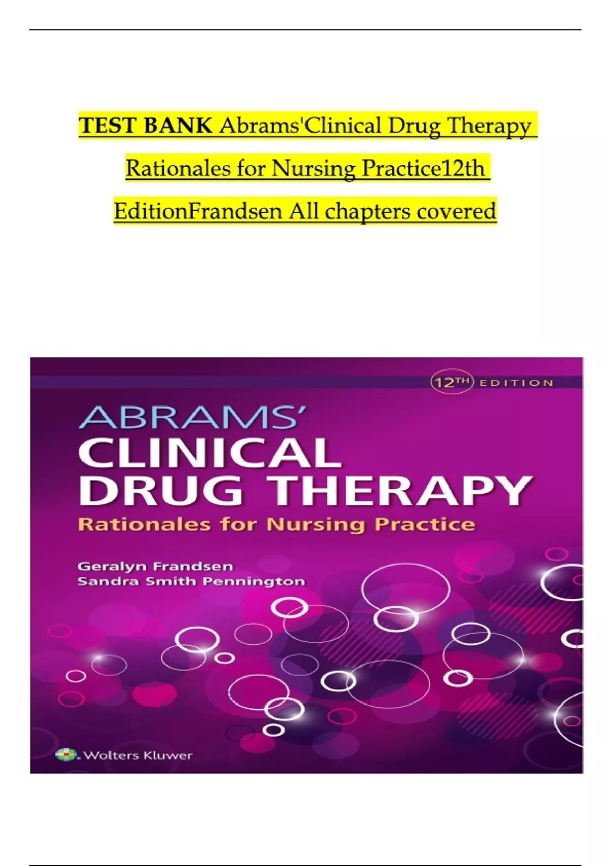 Test Bank For Abrams’ Clinical Drug Therapy Rationales for Nursing Practice 12th Edition Geralyn Frandsen, Complete Chapters 1 - 16, Updated Newest Version