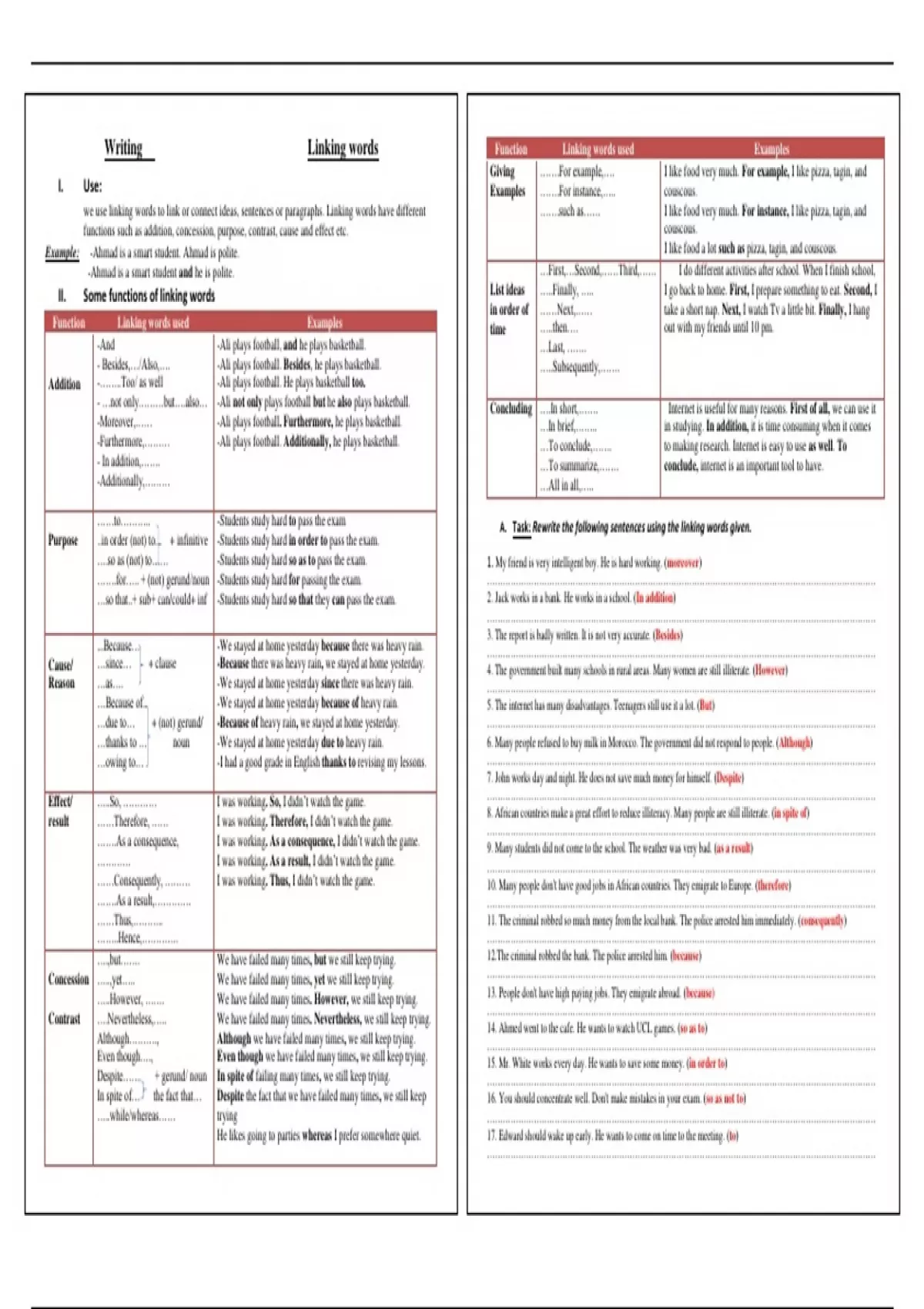 Writing Linking words Function Linking words used Examples