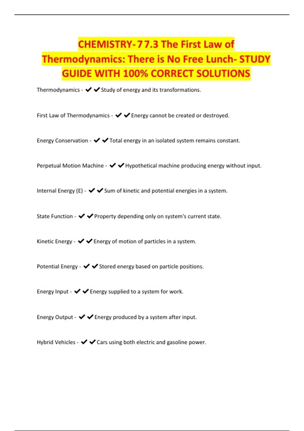 First Law of Thermodynamics - ✔✔Energy cannot be created or destroyed.