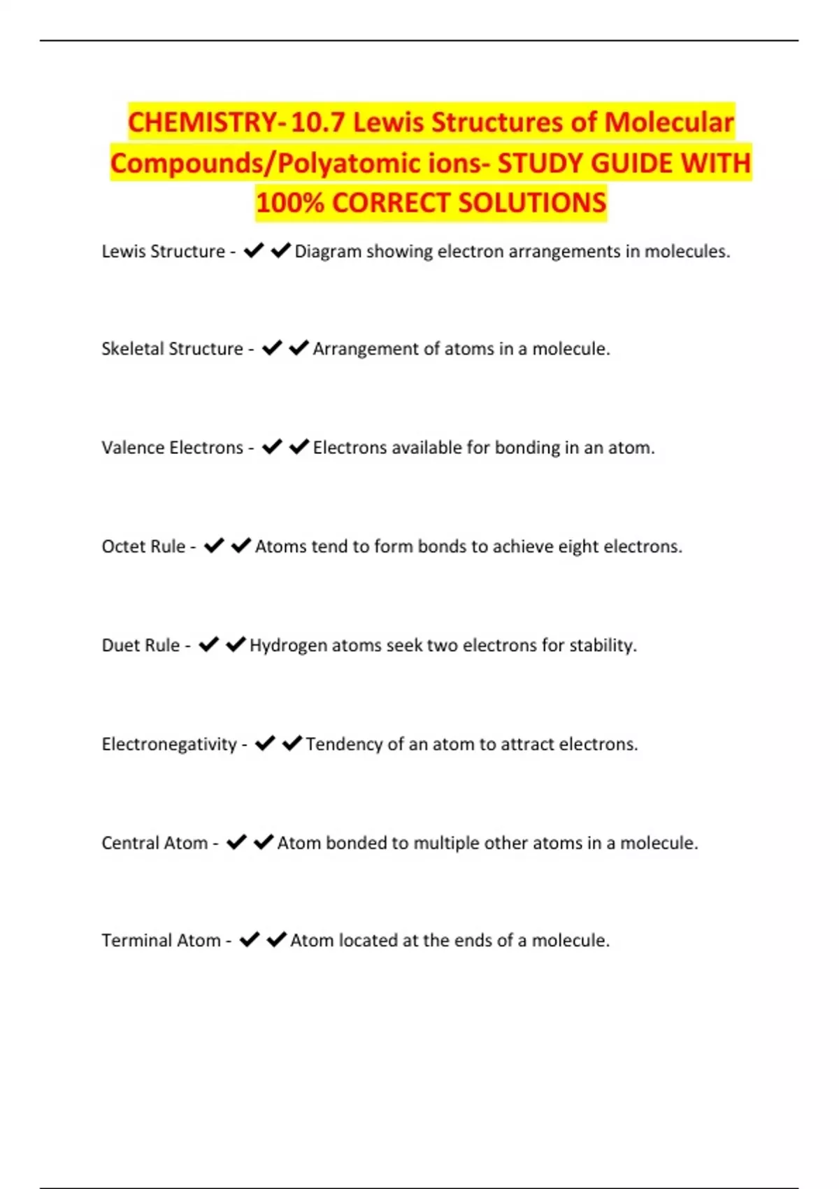 Duet Rule - ✔✔Hydrogen atoms seek two electrons for stability.
