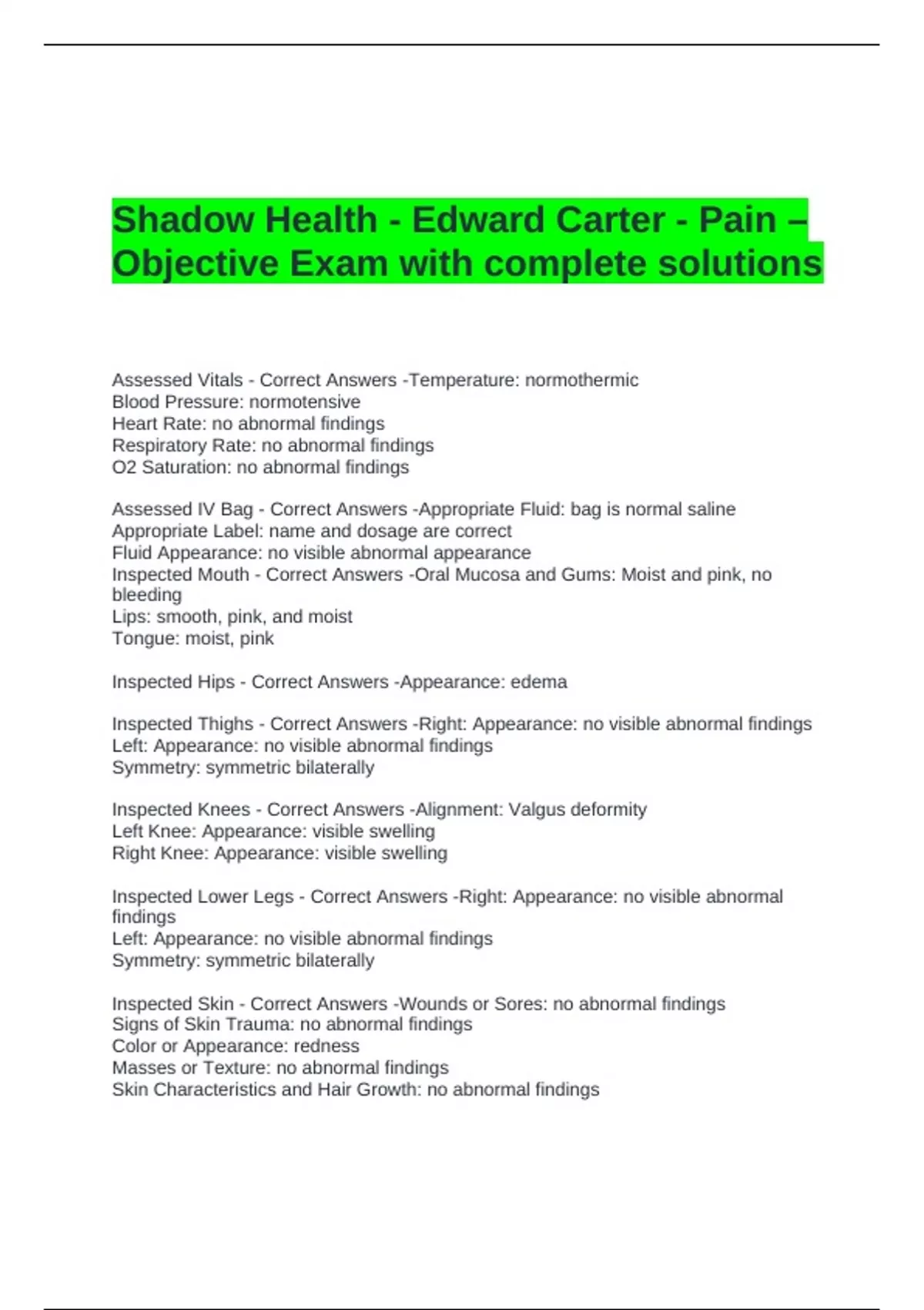 Shadow Health - Edward Carter - Pain – Objective Exam with complete solutions