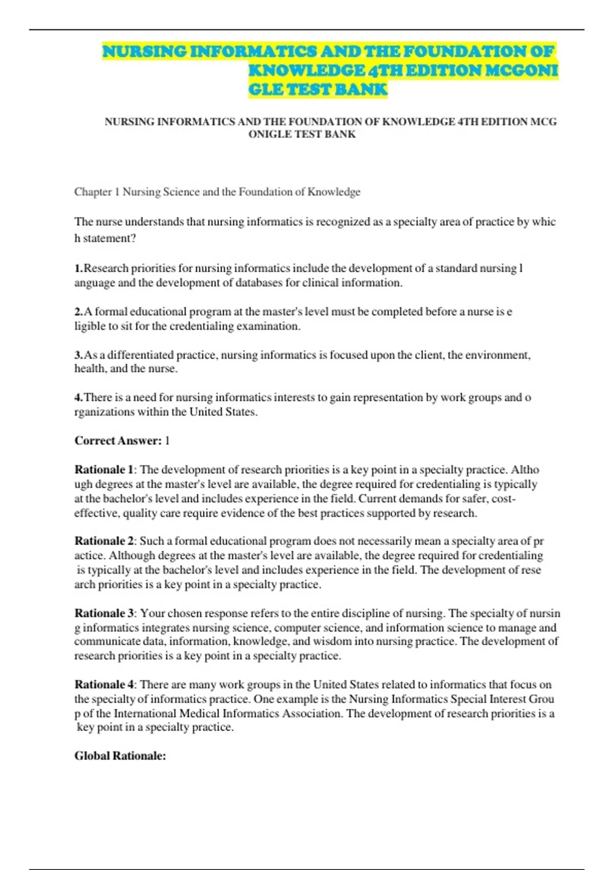 TEST BANK FOR NURSING INFORMATICS AND THE FOUNDATION OF KNOWLEDGE 4TH EDITION MCGONIGLE
