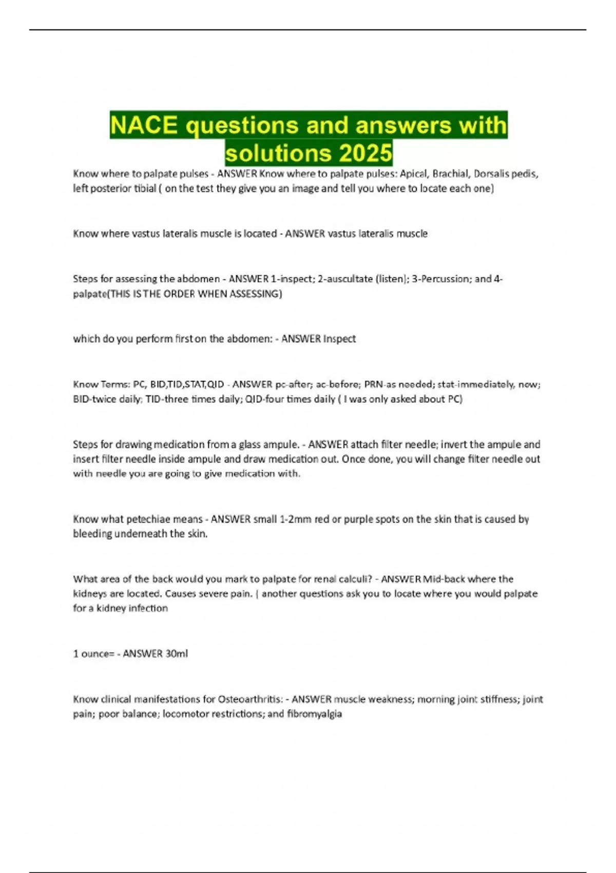 Know where to palpate pulses - ANSWER Know where to palpate pulses: Apical, Brachial, Dorsalis pedis, left posterior tibial ( on the test they give you an image and tell you where to locate each one) Know where vastus lateralis muscle is located - ANSWER vastus lateralis muscle Steps for assessing the abdomen - ANSWER 1-inspect; 2-auscultate (listen); 3-Percussion; and 4-palpate(THIS IS THE ORDER WHEN ASSESSING) which do you perform first on the abdomen: - ANSWER Inspect Know Terms: PC, BID,TID,STAT,QID - ANSWER pc-after; ac-before; PRN-as needed; stat-immediately, now; BID-twice daily; TID-three times daily; QID-four times daily ( I was only asked about PC) Steps for drawing medication from a glass ampule. - ANSWER attach filter needle; invert the ampule and insert filter needle inside ampule and draw medication out. Once done, you will change filter needle out with needle you are going to give medication with. Know what petechiae means - ANSWER small 1-2mm red or purple spots on the skin that is caused by bleeding underneath the skin. What area of the back would you mark to palpate for renal calculi? - ANSWER Mid-back where the kidneys are located. Causes severe pain. ( another questions ask you to locate where you would palpate for a kidney infection 1 ounce= - ANSWER 30ml Know clinical manifestations for Osteoarthritis: - ANSW