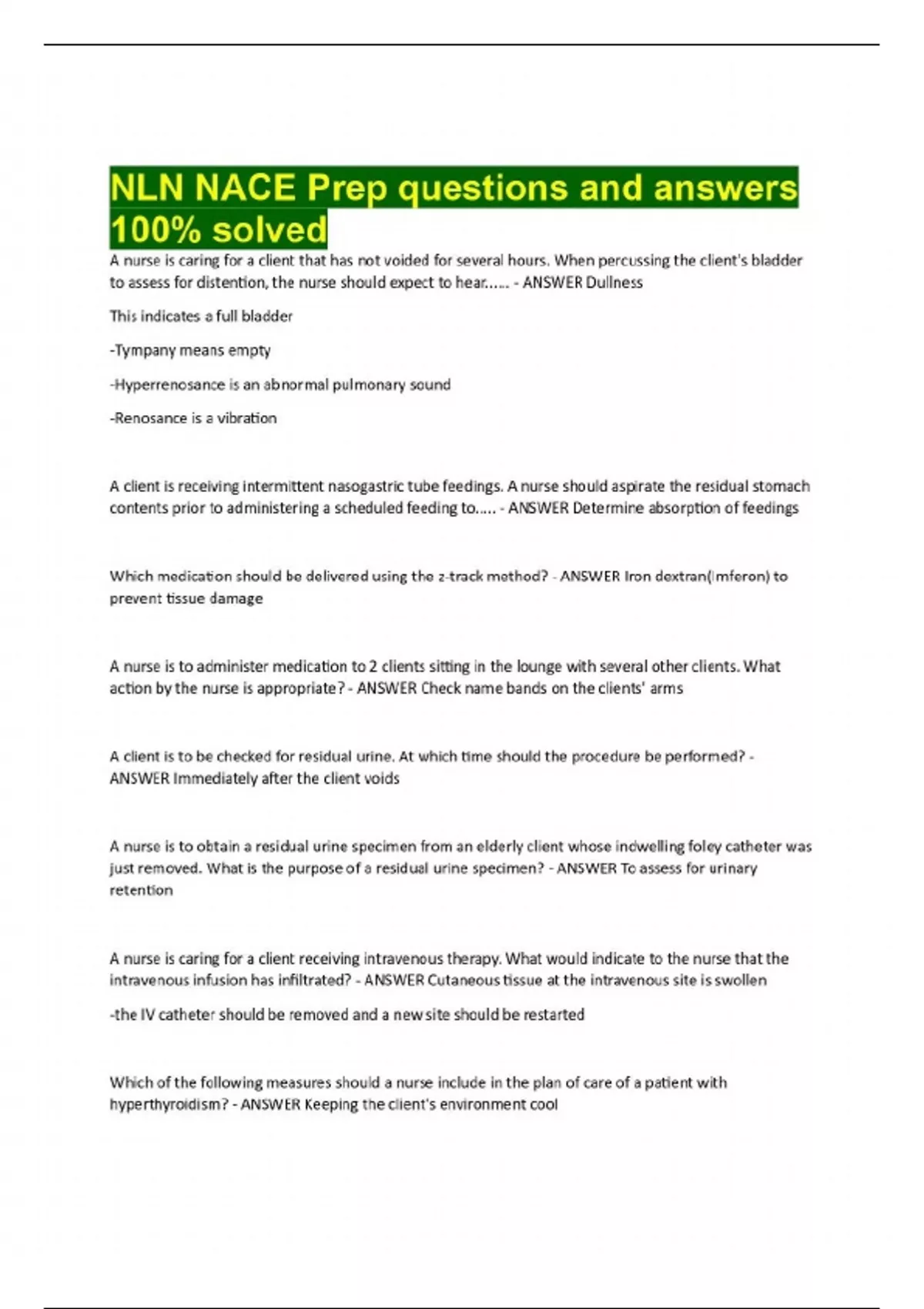 A nurse is caring for a client that has not voided for several hours. When percussing the client's bladder to assess for distention, the nurse should expect to hear...... - ANSWER Dullness This indicates a full bladder -Tympany means empty -Hyperrenosance is an abnormal pulmonary sound -Renosance is a vibration A client is receiving intermittent nasogastric tube feedings. A nurse should aspirate the residual stomach contents prior to administering a scheduled feeding to..... - ANSWER Determine absorption of feedings Which medication should be delivered using the z-track method? - ANSWER Iron dextran(Imferon) to prevent tissue damage A nurse is to administer medication to 2 clients sitting in the lounge with several other clients. What action by the nurse is appropriate? - ANSWER Check name bands on the clients' arms A client is to be checked for residual urine. At which time should the procedure be performed? - ANSWER Immediately after the client voids A nurse is to obtain a residual urine specimen from an elderly client whose indwelling foley catheter was just removed. What is the purpose of a residual urine specimen? - ANSWER To assess for urinary retention A nurse is caring for a client receiving intravenous therapy. What would indicate to the nurse that the intravenous infusion has infiltrated? - ANSWER Cutaneous tissue at the intravenous site is swollen -the IV catheter should be removed and a new site should be restarted Which of the following measures should a nurse include in the plan of care of a patient with hyperthyroidism? - ANSWER Keeping the client's environment cool -A client with hyperthyroidism is heat intolerant