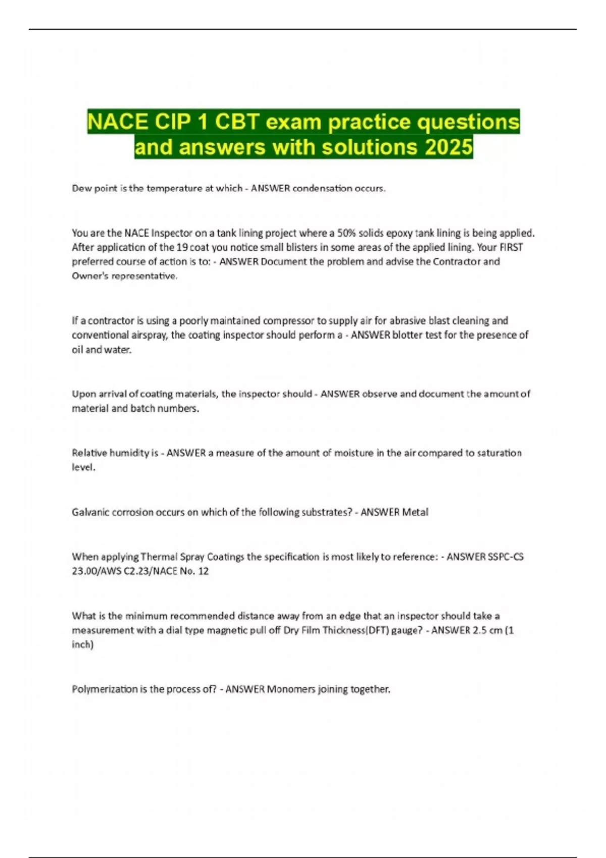 Dew point is the temperature at which - ANSWER condensation occurs. You are the NACE Inspector on a tank lining project where a 50% solids epoxy tank lining is being applied. After application of the 19 coat you notice small blisters in some areas of the applied lining. Your FIRST preferred course of action is to: - ANSWER Document the problem and advise the Contractor and Owner's representative. If a contractor is using a poorly maintained compressor to supply air for abrasive blast cleaning and conventional airspray, the coating inspector should perform a - ANSWER blotter test for the presence of oil and water. Upon arrival of coating materials, the inspector should - ANSWER observe and document the amount of material and batch numbers. Relative humidity is - ANSWER a measure of the amount of moisture in the air compared to saturation level. Galvanic corrosion occurs on which of the following substrates? - ANSWER Metal When applying Thermal Spray Coatings the specification is most likely to reference: - ANSWER SSPC-CS 23.00/AWS C2.23/NACE No. 12 What is the minimum recommended distance away from an edge that an inspector should take a measurement with a dial type magnetic pull off Dry Film Thickness(DFT) gauge? - ANSWER 2.5 cm (1 inch) Polymerization is the process of? - ANSWER Monomers joining together. An exposed area of the substrate or previous coat of a conductive material, often caused by poor application technique is called: - ANSWER Holiday Checking is: - ANSWER a fine crack in the surface of a coating that rarely reaches the substrate. Inspection documentation is important because: - ANSWER Owners use the documentation for a variety of purposes. An Inspectors personal log book should contain: - ANSWER No comments regarding the application team. You have just received your NACE CIP Level 1 certification when you are asked to supervise a team of uncertified field pipeline inspectors. Your FIRST preferred course of action is to: - ANSWER Review the NACE Attestation prior to making a decision.