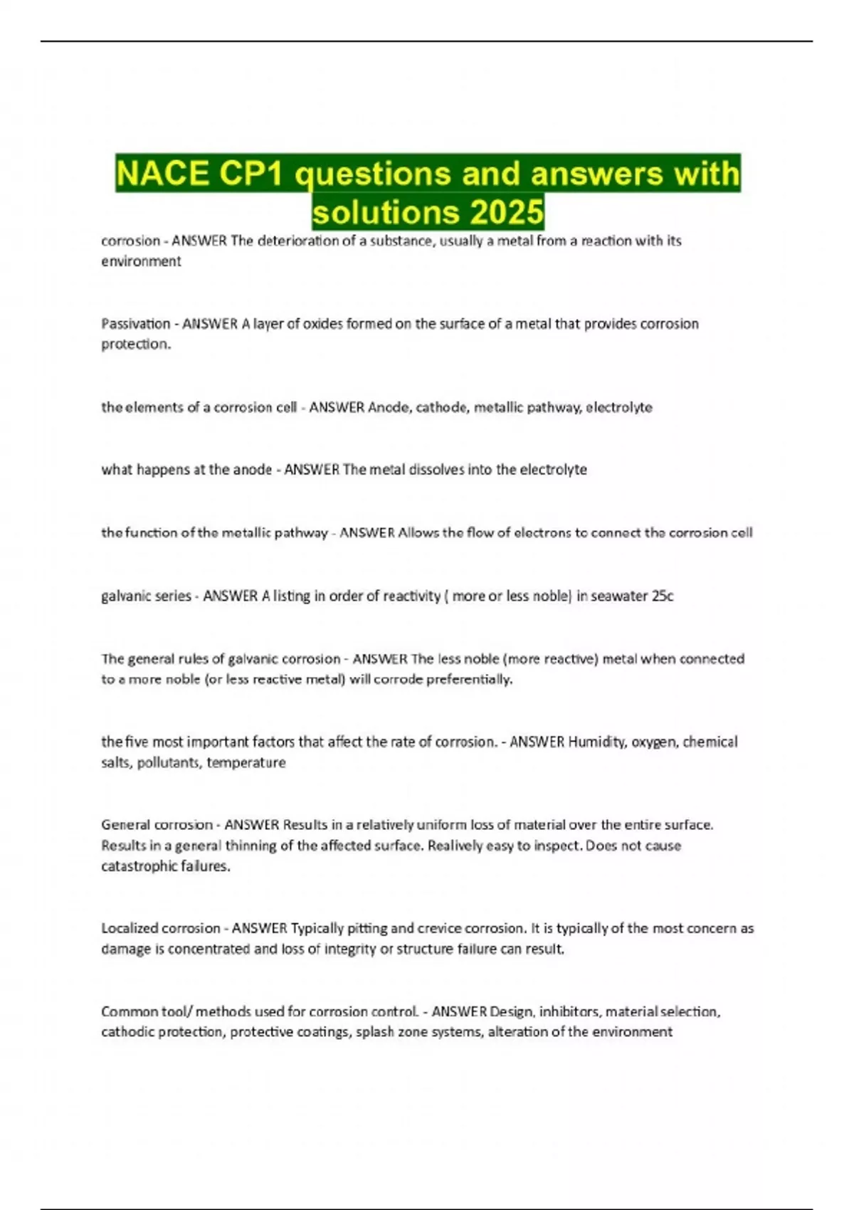 corrosion - ANSWER The deterioration of a substance, usually a metal from a reaction with its environment Passivation - ANSWER A layer of oxides formed on the surface of a metal that provides corrosion protection. the elements of a corrosion cell - ANSWER Anode, cathode, metallic pathway, electrolyte what happens at the anode - ANSWER The metal dissolves into the electrolyte the function of the metallic pathway - ANSWER Allows the flow of electrons to connect the corrosion cell galvanic series - ANSWER A listing in order of reactivity ( more or less noble) in seawater 25c The general rules of galvanic corrosion - ANSWER The less noble (more reactive) metal when connected to a more noble (or less reactive metal) will corrode preferentially. the five most important factors that affect the rate of corrosion. - ANSWER Humidity, oxygen, chemical salts, pollutants, temperature General corrosion - ANSWER Results in a relatively uniform loss of material over the entire surface. Results in a general thinning of the affected surface. Realively easy to inspect. Does not cause catastrophic failures. Localized corrosion - ANSWER Typically pitting and crevice corrosion. It is typically of the most concern as damage is concentrated and loss of integrity or structure failure can result. Common tool/ methods used for corrosion control. - ANSWER Design, inhibitors, material selection, cathodic protection, protective coatings, splas
