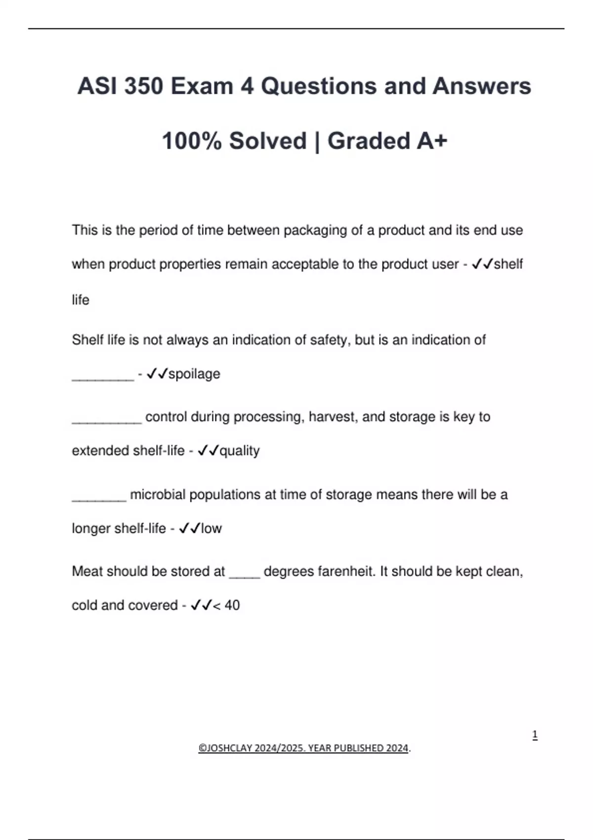 ASI 350 Exam 4 Questions and Answers 100% Solved | Graded A+ This is the period of time between packaging of a product and its end use when product properties remain acceptable to the product user - shelf life Shelf life is not always an indication of safety, but is an indication of ________ - spoilage _________ control during processing, harvest, and storage is key to extended shelf-life - quality _______ microbial populations at time of storage means there will be a longer shelf-life - low Meat should be stored at ____ degrees farenheit. It should be kept clean, cold and covered - < 40