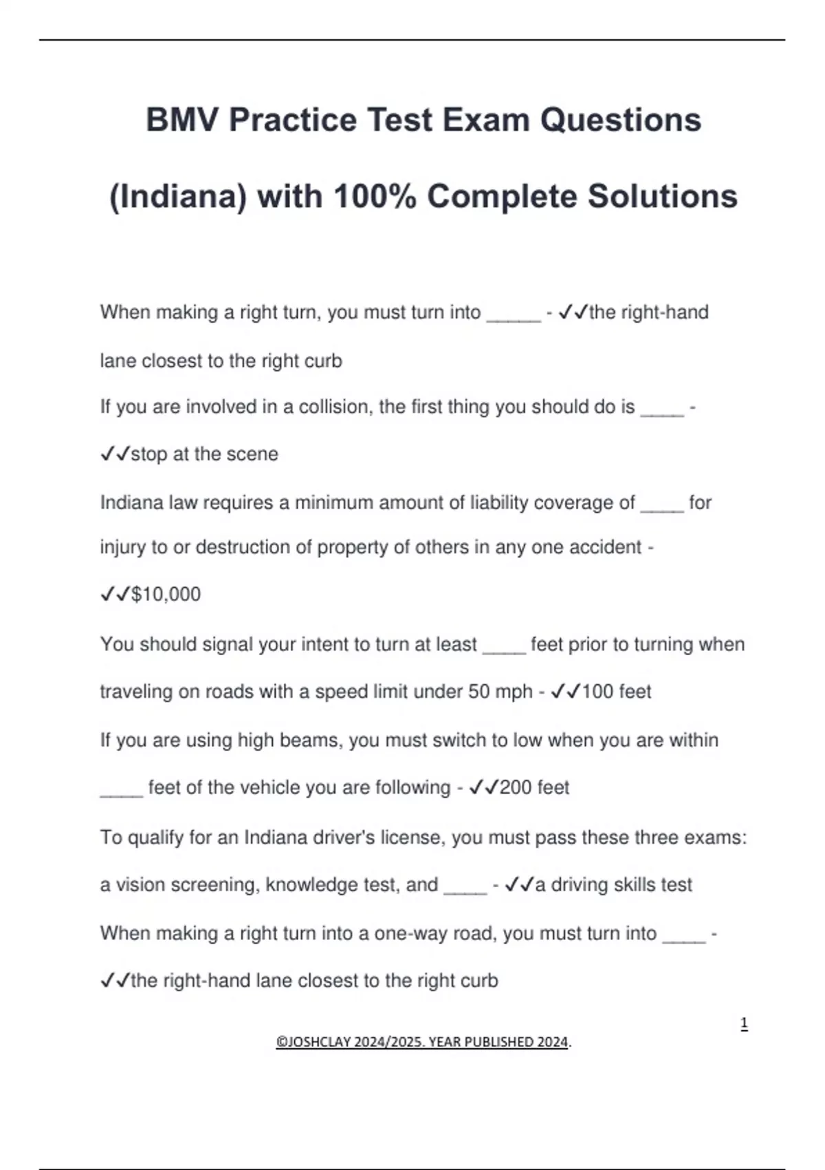 BMV Practice Test Exam Questions (Indiana) with 100% Complete Solutions When making a right turn, you must turn into _____ - the right-hand lane closest to the right curb If you are involved in a collision, the first thing you should do is ____ - stop at the scene Indiana law requires a minimum amount of liability coverage of ____ for injury to or destruction of property of others in any one accident - $10,000 You should signal your intent to turn at least ____ feet prior to turning when traveling on roads with a speed limit under 50 mph - 100 feet If you are using high beams, you must switch to low when you are within ____ feet of the vehicle you are following - 200 feet To qualify for an Indiana driver's license, you must pass these three exams: a vision screening, knowledge test, and ____ - a driving skills test When making a right turn into a one-way road, you must turn into ____ - the right-hand lane closest to the right curb