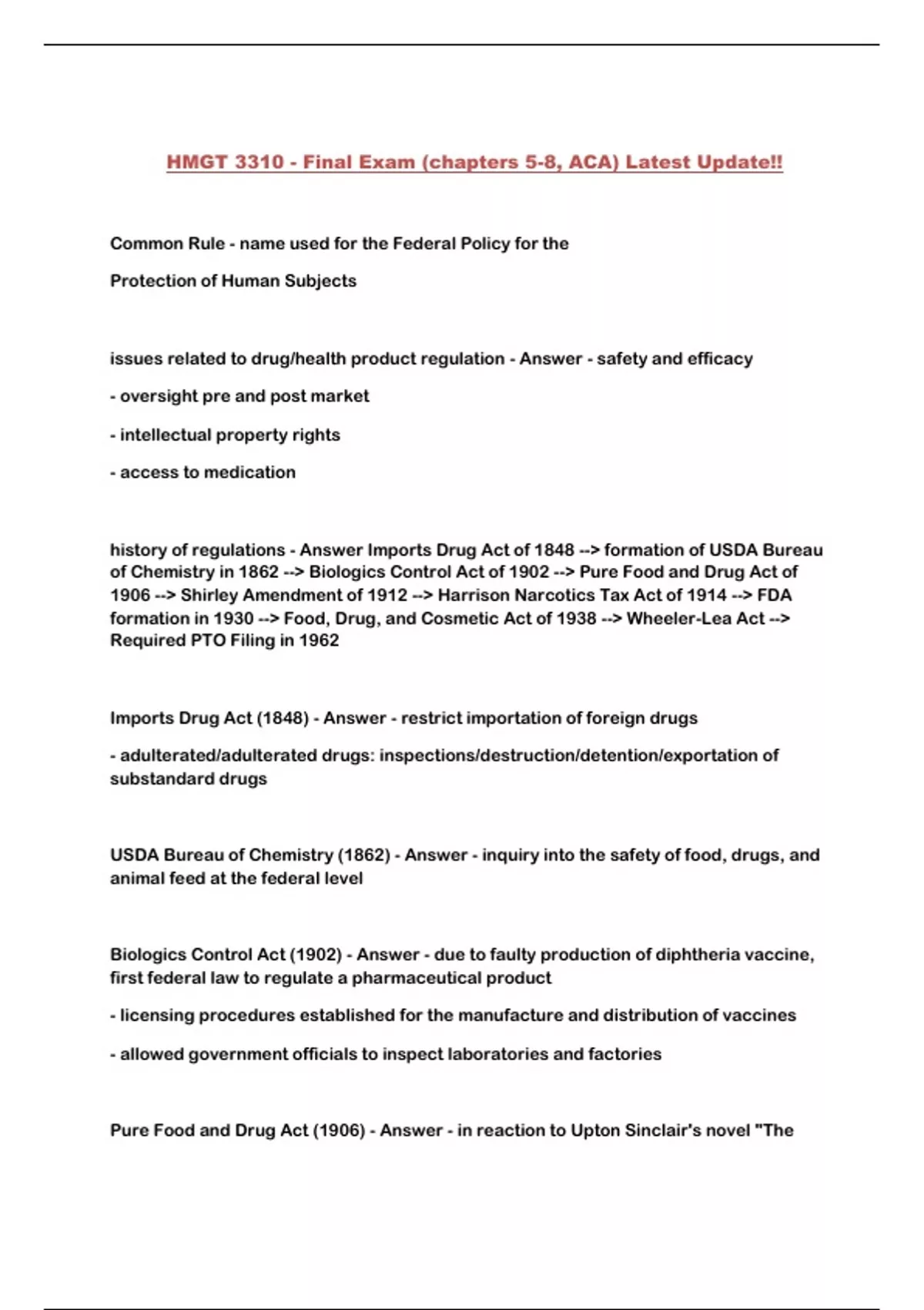 HMGT 3310 - Final Exam (chapters 5-8, ACA) Latest Update!!...
