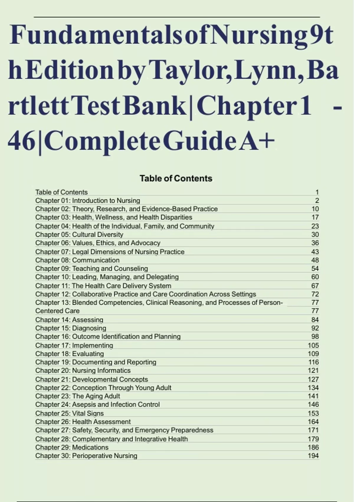 , FundamentalsxofxNursingx9thxEditionxbyxTaylor,xLynn,xBartlettxTestxBankx|xChapterx1 -46x|CompletexGuidexA+x x