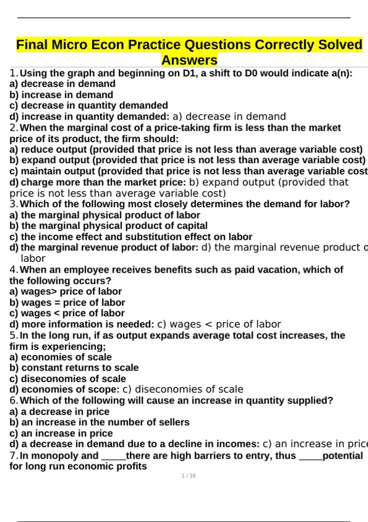 Final Micro Econ Practice Questions Correctly Solved Answers
